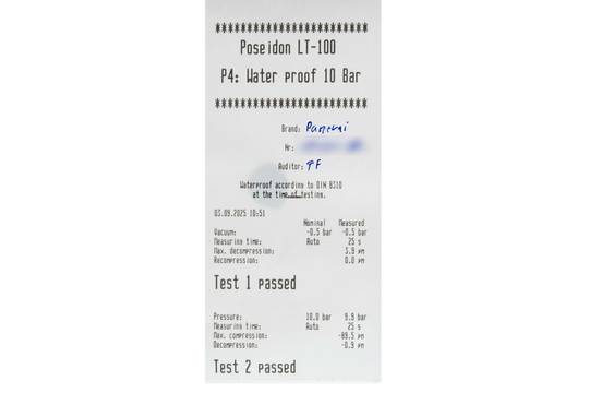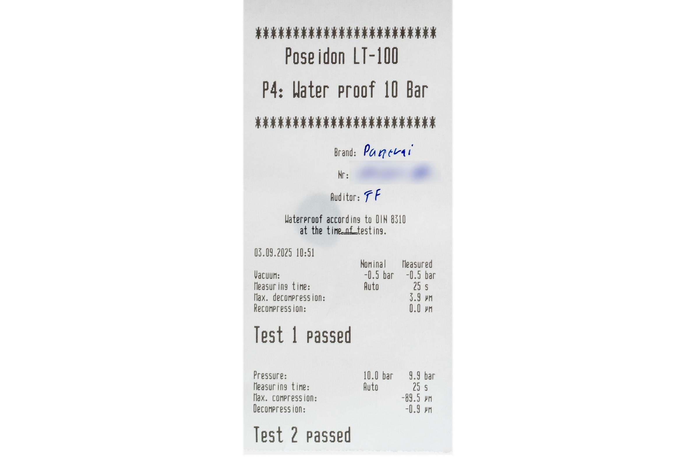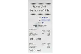 * Wenn die Uhr positiv auf Wasserdichtigkeit getestet wurde, dann gilt diese Eigenschaft zum Zeitpunkt der Messung. Wasserdichtigkeit ist nach DIN 8310 keine bleibende Eigenschaft. Sie sollte jährlich und vor besonderen Belastungen überprüft werden, da die eingebauten Dichtelemente in ihrer Funktion und im täglichen Gebrauch nachlassen. Einflüsse wie starke Temperaturschwankungen, Chlor, Seife oder Salzwasser wirken sich negativ auf die Wasserdichtigkeit aus.