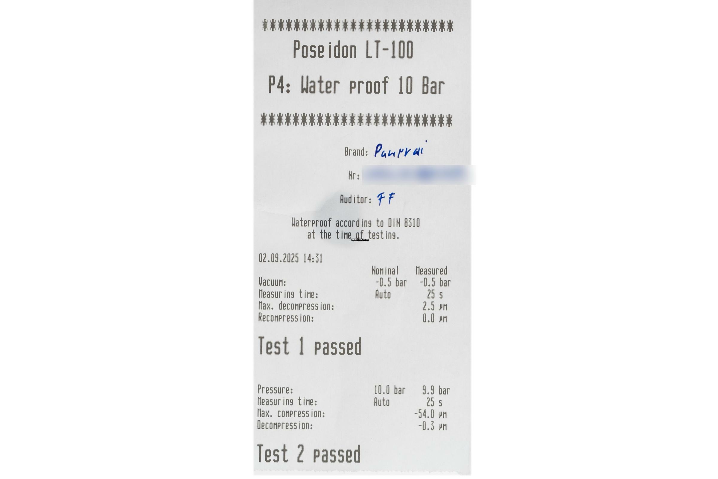 * Wenn die Uhr positiv auf Wasserdichtigkeit getestet wurde, dann gilt diese Eigenschaft zum Zeitpunkt der Messung. Wasserdichtigkeit ist nach DIN 8310 keine bleibende Eigenschaft. Sie sollte jährlich und vor besonderen Belastungen überprüft werden, da die eingebauten Dichtelemente in ihrer Funktion und im täglichen Gebrauch nachlassen. Einflüsse wie starke Temperaturschwankungen, Chlor, Seife oder Salzwasser wirken sich negativ auf die Wasserdichtigkeit aus.