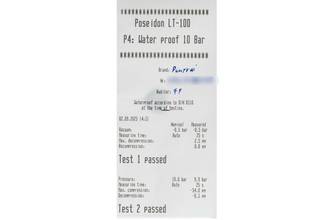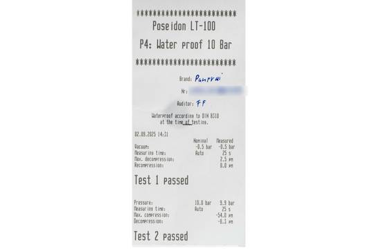 - Wasserdichtigkeit*: ja. Das Prüfprotokoll mit Prüfdruckangabe liegt bei.