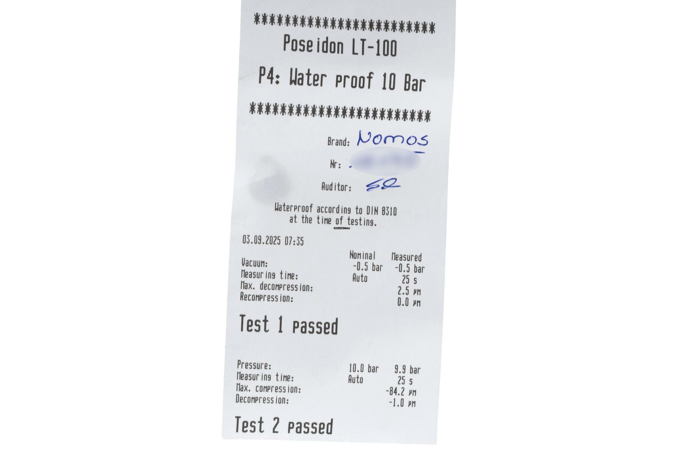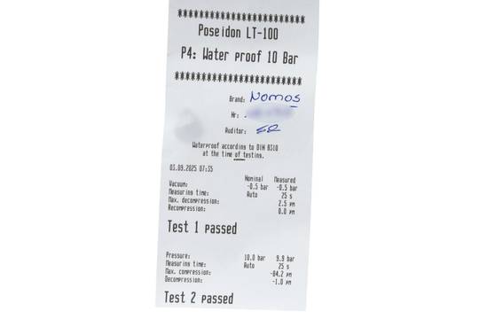 * Wenn die Uhr positiv auf Wasserdichtigkeit getestet wurde, dann gilt diese Eigenschaft zum Zeitpunkt der Messung. Wasserdichtigkeit ist nach DIN 8310 keine bleibende Eigenschaft. Sie sollte jährlich und vor besonderen Belastungen überprüft werden, da die eingebauten Dichtelemente in ihrer Funktion und im täglichen Gebrauch nachlassen. Einflüsse wie starke Temperaturschwankungen, Chlor, Seife oder Salzwasser wirken sich negativ auf die Wasserdichtigkeit aus.