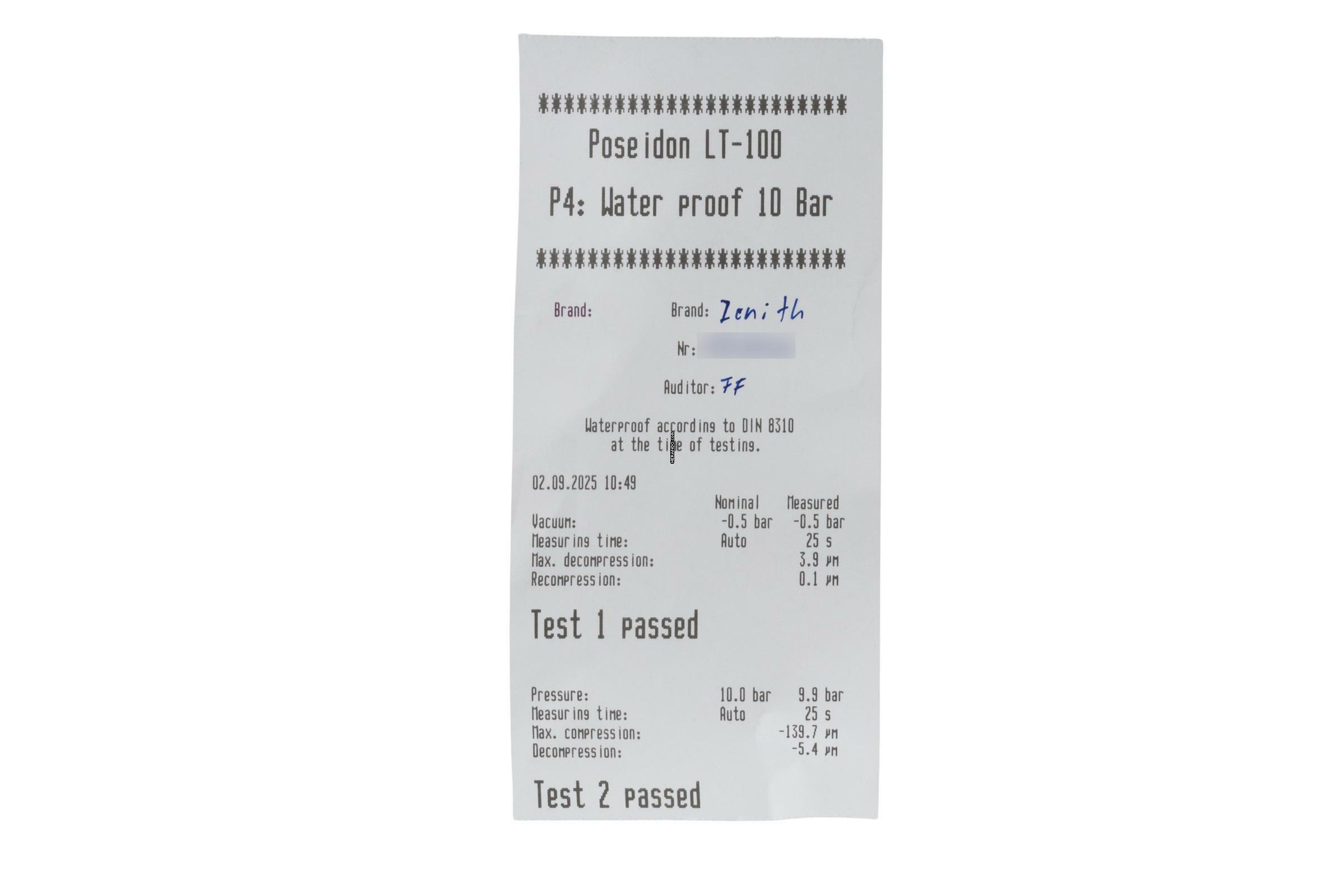 * Wenn die Uhr positiv auf Wasserdichtigkeit getestet wurde, dann gilt diese Eigenschaft zum Zeitpunkt der Messung. Wasserdichtigkeit ist nach DIN 8310 keine bleibende Eigenschaft. Sie sollte jährlich und vor besonderen Belastungen überprüft werden, da die eingebauten Dichtelemente in ihrer Funktion und im täglichen Gebrauch nachlassen. Einflüsse wie starke Temperaturschwankungen, Chlor, Seife oder Salzwasser wirken sich negativ auf die Wasserdichtigkeit aus.