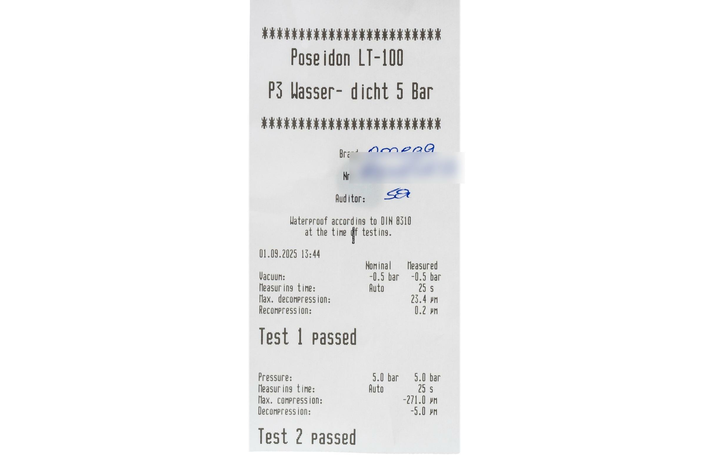 * Wenn die Uhr positiv auf Wasserdichtigkeit getestet wurde, dann gilt diese Eigenschaft zum Zeitpunkt der Messung. Wasserdichtigkeit ist nach DIN 8310 keine bleibende Eigenschaft. Sie sollte jährlich und vor besonderen Belastungen überprüft werden, da die eingebauten Dichtelemente in ihrer Funktion und im täglichen Gebrauch nachlassen. Einflüsse wie starke Temperaturschwankungen, Chlor, Seife oder Salzwasser wirken sich negativ auf die Wasserdichtigkeit aus.