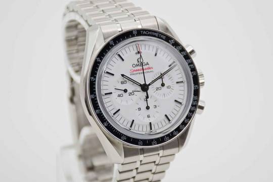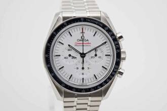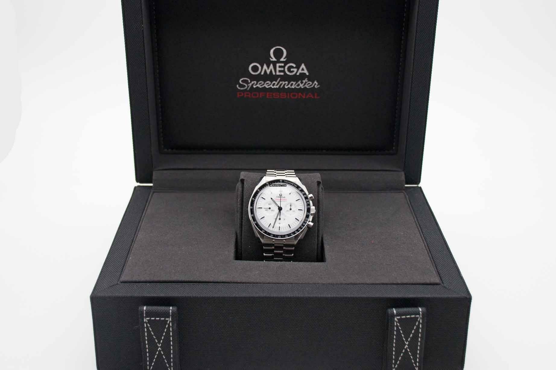 Speedmaster Professional Moonwatch White 310.30.42.50.04.001, 42 mm case with white dial and Omega steel bracelet. Stunning Moonwatch full set with inner and outer Omega box with Moonwatch booklet, Pictogram card, Chronometer certificate, Master Chronometer card, original Omega invoice and Omega warranty card from 2024. Herando certification included. The watch comes in perfect and mint condition like new. Trades are possible, please contact us directly for a quote. Keep in mind that our complete inventory is stored in our bank safe for safety purposes.