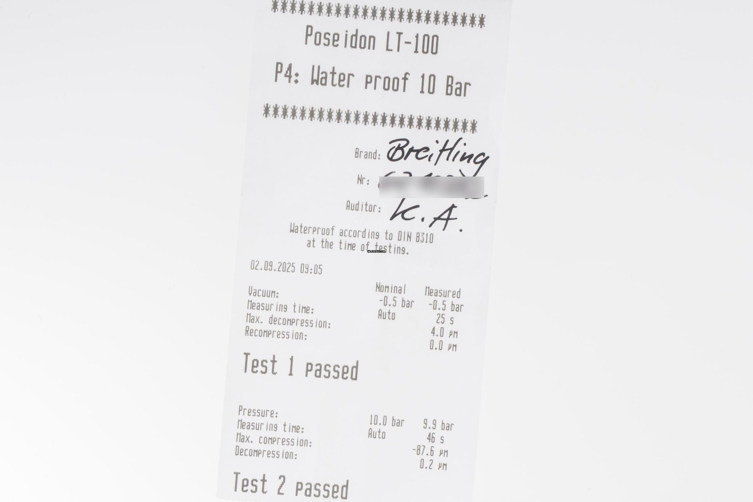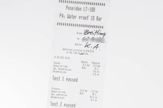 * Wenn die Uhr positiv auf Wasserdichtigkeit getestet wurde, dann gilt diese Eigenschaft zum Zeitpunkt der Messung. Wasserdichtigkeit ist nach DIN 8310 keine bleibende Eigenschaft. Sie sollte jährlich und vor besonderen Belastungen überprüft werden, da die eingebauten Dichtelemente in ihrer Funktion und im täglichen Gebrauch nachlassen. Einflüsse wie starke Temperaturschwankungen, Chlor, Seife oder Salzwasser wirken sich negativ auf die Wasserdichtigkeit aus.