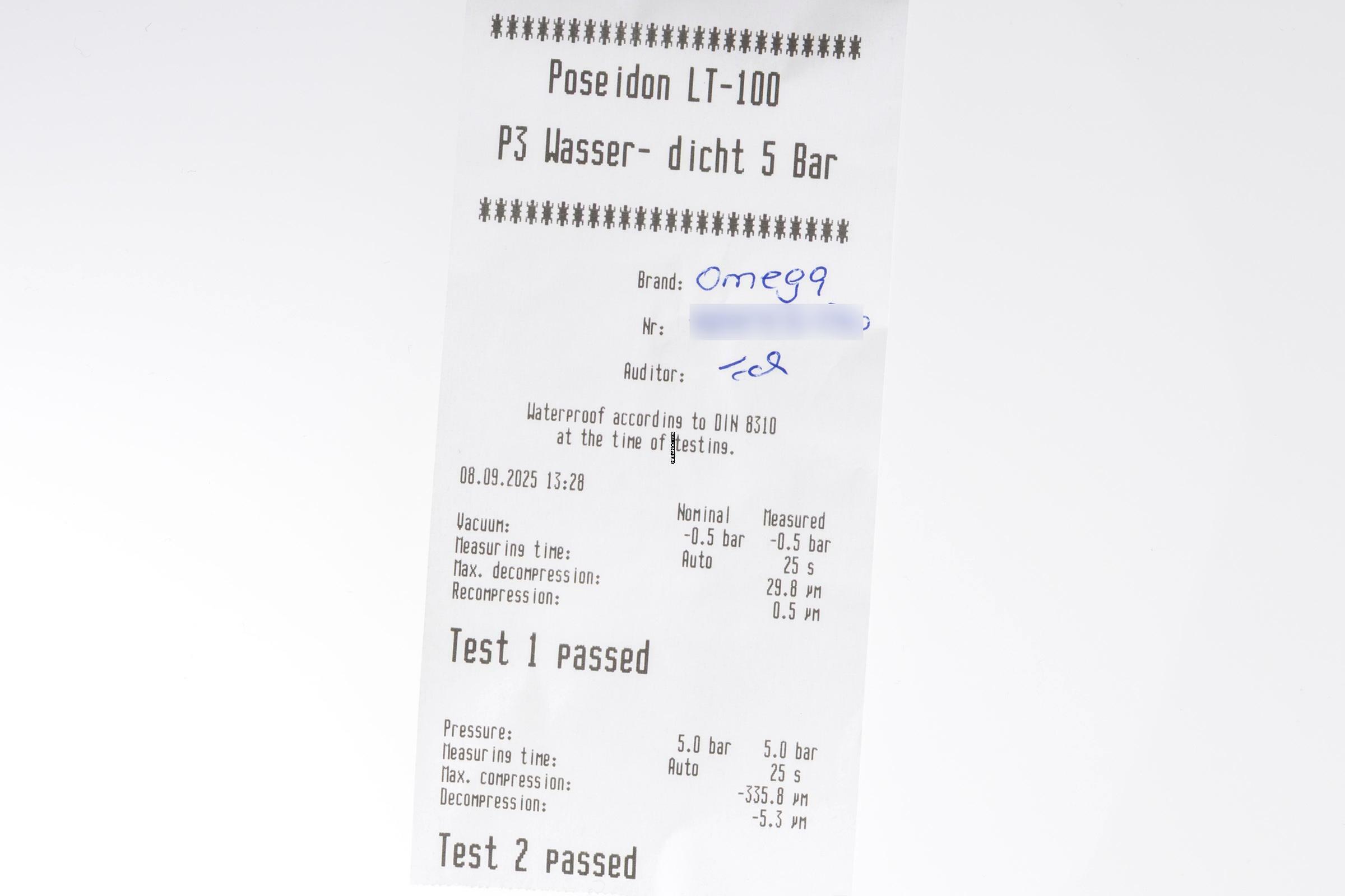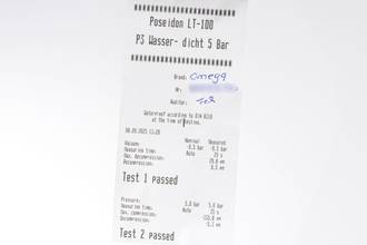 * Wenn die Uhr positiv auf Wasserdichtigkeit getestet wurde, dann gilt diese Eigenschaft zum Zeitpunkt der Messung. Wasserdichtigkeit ist nach DIN 8310 keine bleibende Eigenschaft. Sie sollte jährlich und vor besonderen Belastungen überprüft werden, da die eingebauten Dichtelemente in ihrer Funktion und im täglichen Gebrauch nachlassen. Einflüsse wie starke Temperaturschwankungen, Chlor, Seife oder Salzwasser wirken sich negativ auf die Wasserdichtigkeit aus.