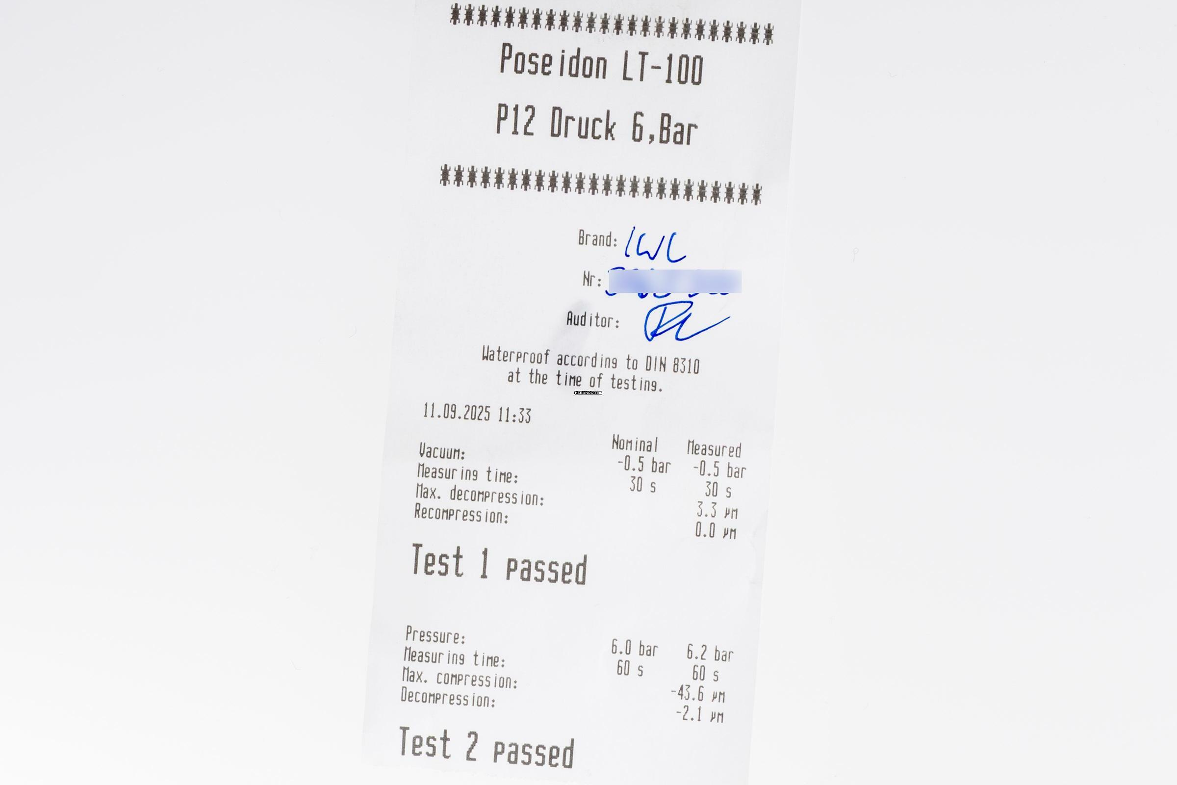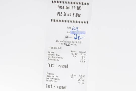 * Wenn die Uhr positiv auf Wasserdichtigkeit getestet wurde, dann gilt diese Eigenschaft zum Zeitpunkt der Messung. Wasserdichtigkeit ist nach DIN 8310 keine bleibende Eigenschaft. Sie sollte jährlich und vor besonderen Belastungen überprüft werden, da die eingebauten Dichtelemente in ihrer Funktion und im täglichen Gebrauch nachlassen. Einflüsse wie starke Temperaturschwankungen, Chlor, Seife oder Salzwasser wirken sich negativ auf die Wasserdichtigkeit aus.