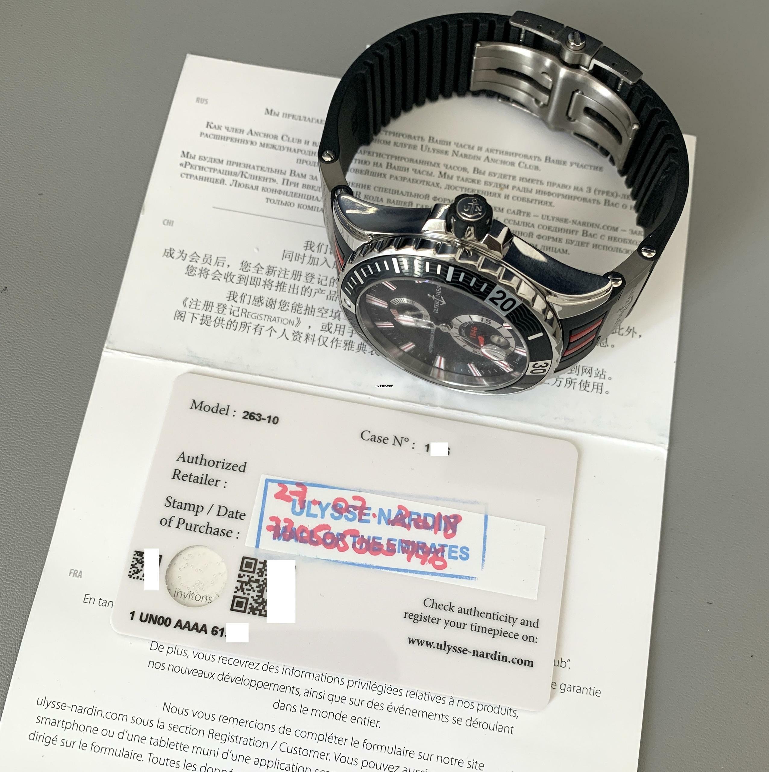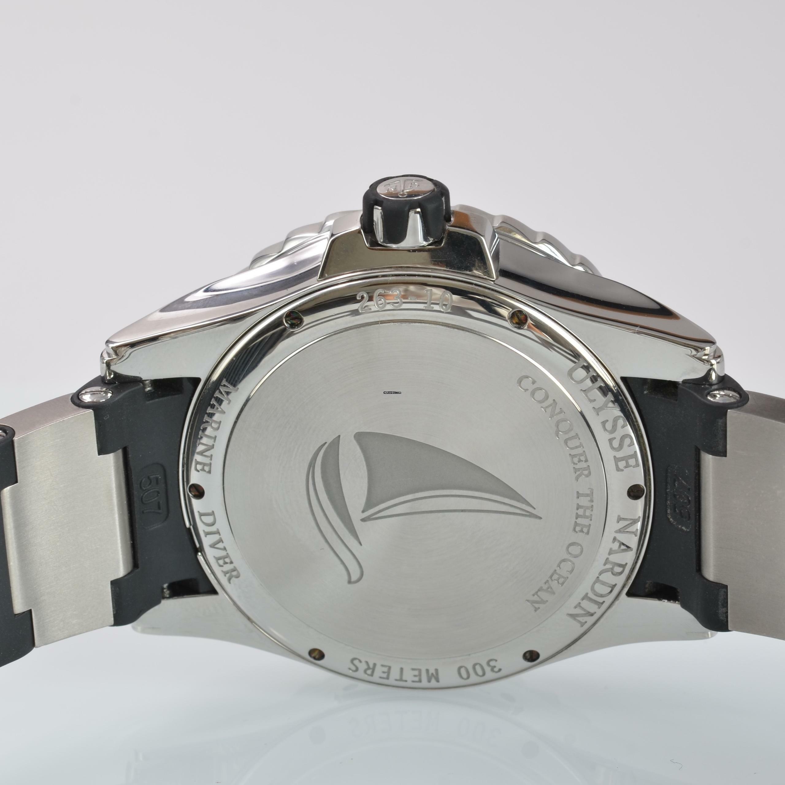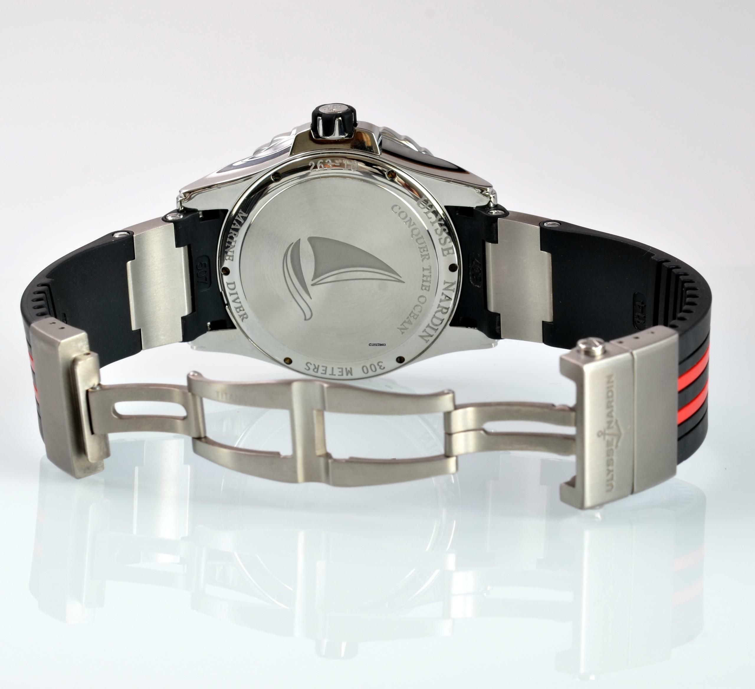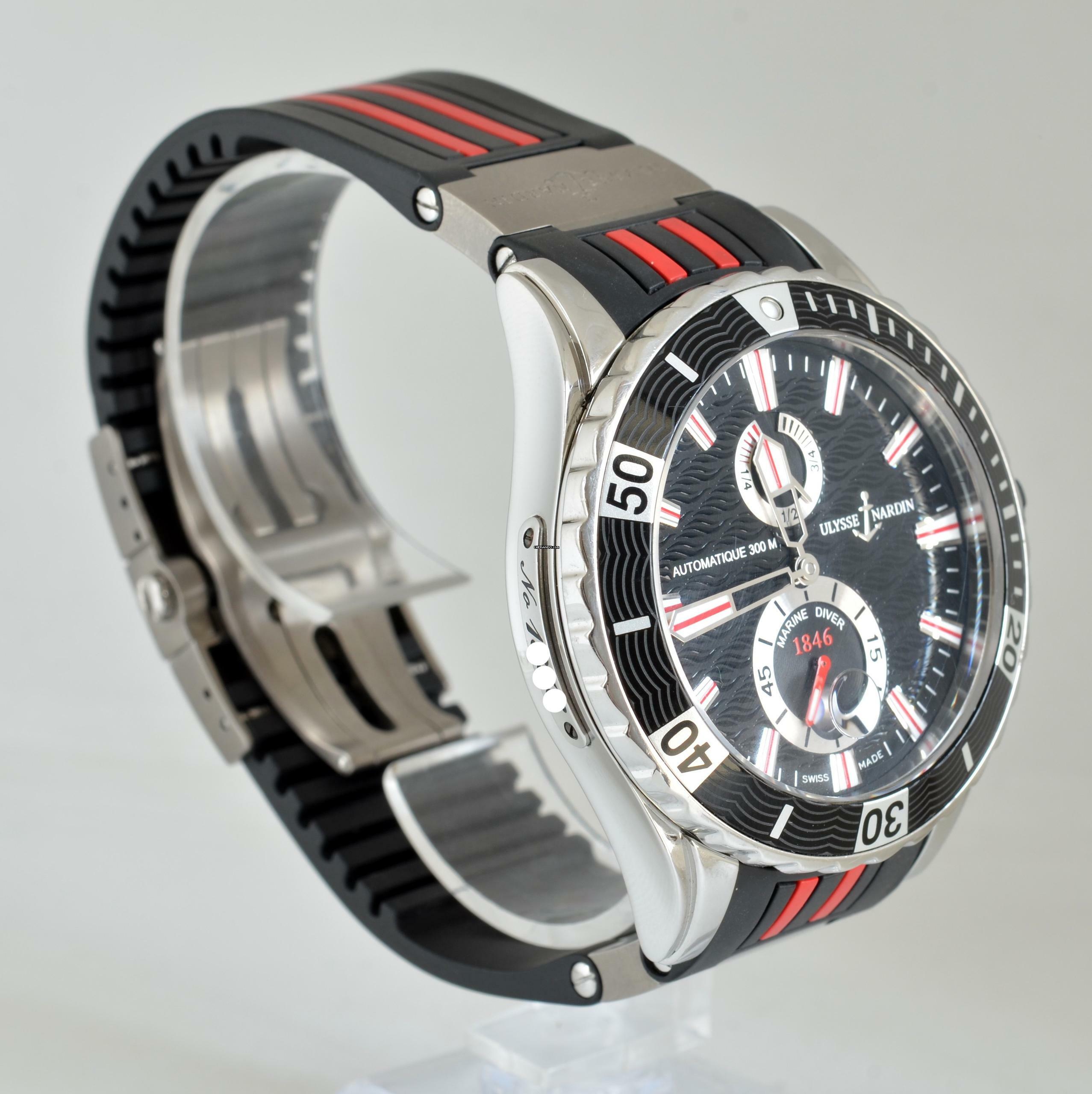 Ulysse Nardin Marine Diver Chronometer steel, year of production 2018, unidirectional steel bezel with black colour insert to graduated scale, sapphire glass anti-reflective, black colour dial with date, seconds counter at 06:00 hours, indexes and hands to LumiNova, automatic winding mechanical movement, black colour rubber watch strap with double titanium deployante closure original Ulysse Nardin.