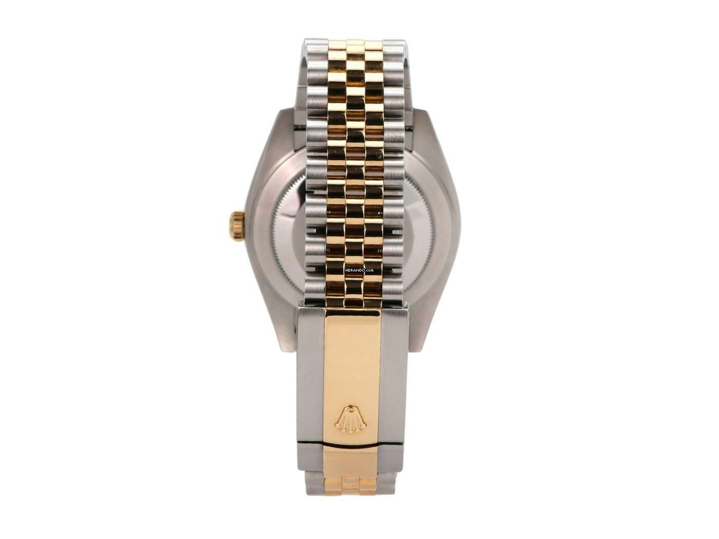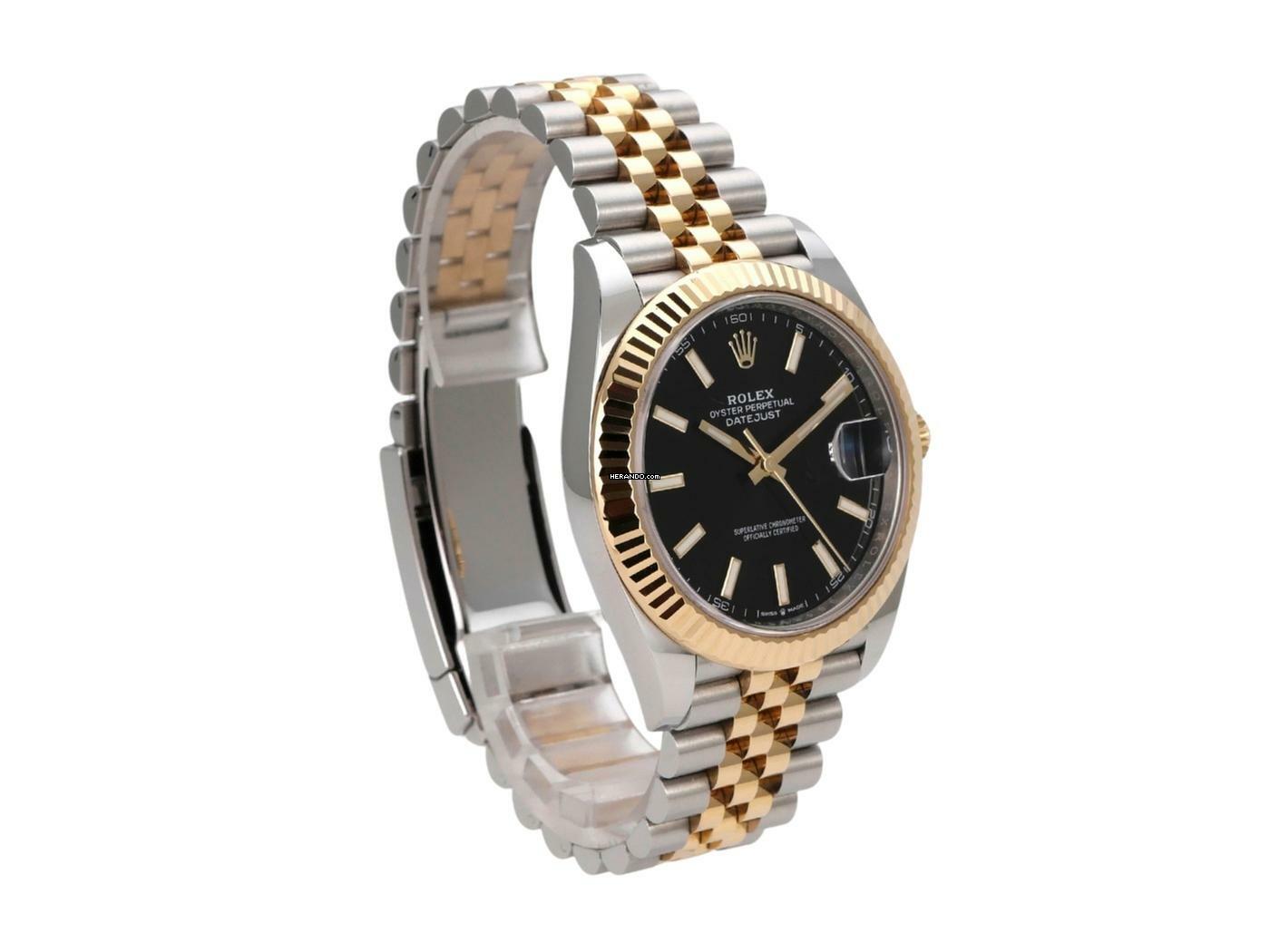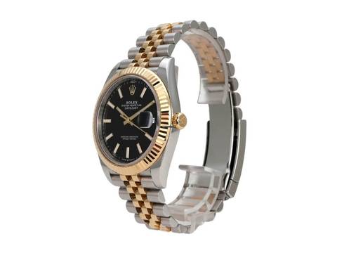 Gehäuse aus Edelstahl / Gelbgold poliert und satiniert, Gehäusedurchmesser 41 mm, polierte 18 kt Gelbgold Lünette, Jubile Armband aus Edelstahl / 18 kt Gelbgold poliert und satiniert mit Faltschließe, schwarzes Zifferblatt mit 18 kt Gelbgold Leuchtindizes, 18 kt Gelbgold Leuchtzeiger, Automatikwerk, Rolex Manufakturkaliber 3235, Chronometer, 70 Stunden Gangreserve, Datumsanzeige, kratzfestes Saphirglas, verschraubte 18 kt Gelbgold Krone, Edelstahlboden verschraubt, wasserdicht bis zu 10 bar.