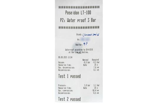 * Wenn die Uhr positiv auf Wasserdichtigkeit getestet wurde, dann gilt diese Eigenschaft zum Zeitpunkt der Messung. Wasserdichtigkeit ist nach DIN 8310 keine bleibende Eigenschaft. Sie sollte jährlich und vor besonderen Belastungen überprüft werden, da die eingebauten Dichtelemente in ihrer Funktion und im täglichen Gebrauch nachlassen. Einflüsse wie starke Temperaturschwankungen, Chlor, Seife oder Salzwasser wirken sich negativ auf die Wasserdichtigkeit aus.