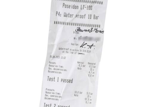 * Wenn die Uhr positiv auf Wasserdichtigkeit getestet wurde, dann gilt diese Eigenschaft zum Zeitpunkt der Messung. Wasserdichtigkeit ist nach DIN 8310 keine bleibende Eigenschaft. Sie sollte jährlich und vor besonderen Belastungen überprüft werden, da die eingebauten Dichtelemente in ihrer Funktion und im täglichen Gebrauch nachlassen. Einflüsse wie starke Temperaturschwankungen, Chlor, Seife oder Salzwasser wirken sich negativ auf die Wasserdichtigkeit aus.