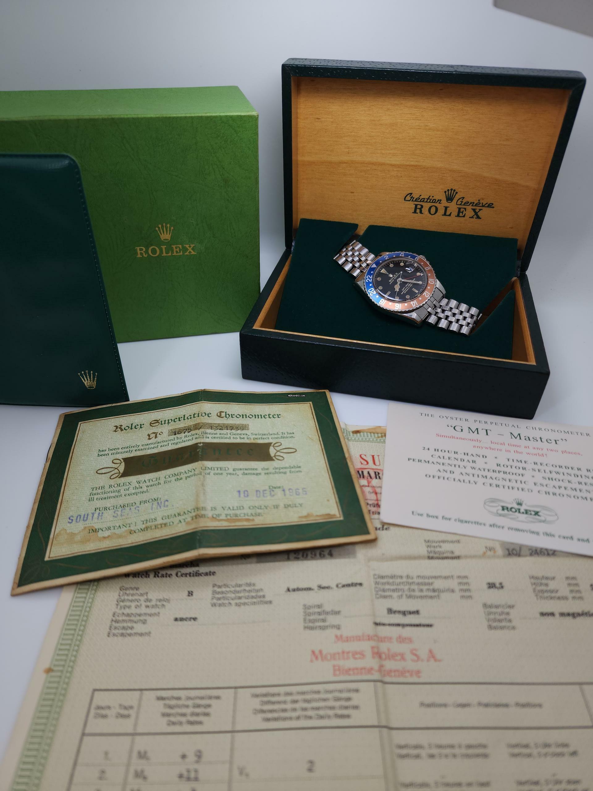 Im Lieferumfang enthalten: Rolex 1675 Box, doppelte Papiere, Chronometer, GMT Master-Papier, Original-Seriennummern-/Modellnummernschild.