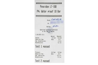 - Wasserdichtigkeit*: ja. Das Prüfprotokoll mit Prüfdruckangabe liegt bei.