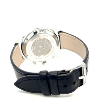 38 mm grosses Gehäuse aus poliertem Stahl 316 L. Blaues, sonnenbeschienenes Zifferblatt mit silbernem Doppelzähler und Zähler für die kleine Sekunde bei 9 Uhr. Doppelt gewölbtes Saphirglas mit Antireflexbeschichtung.