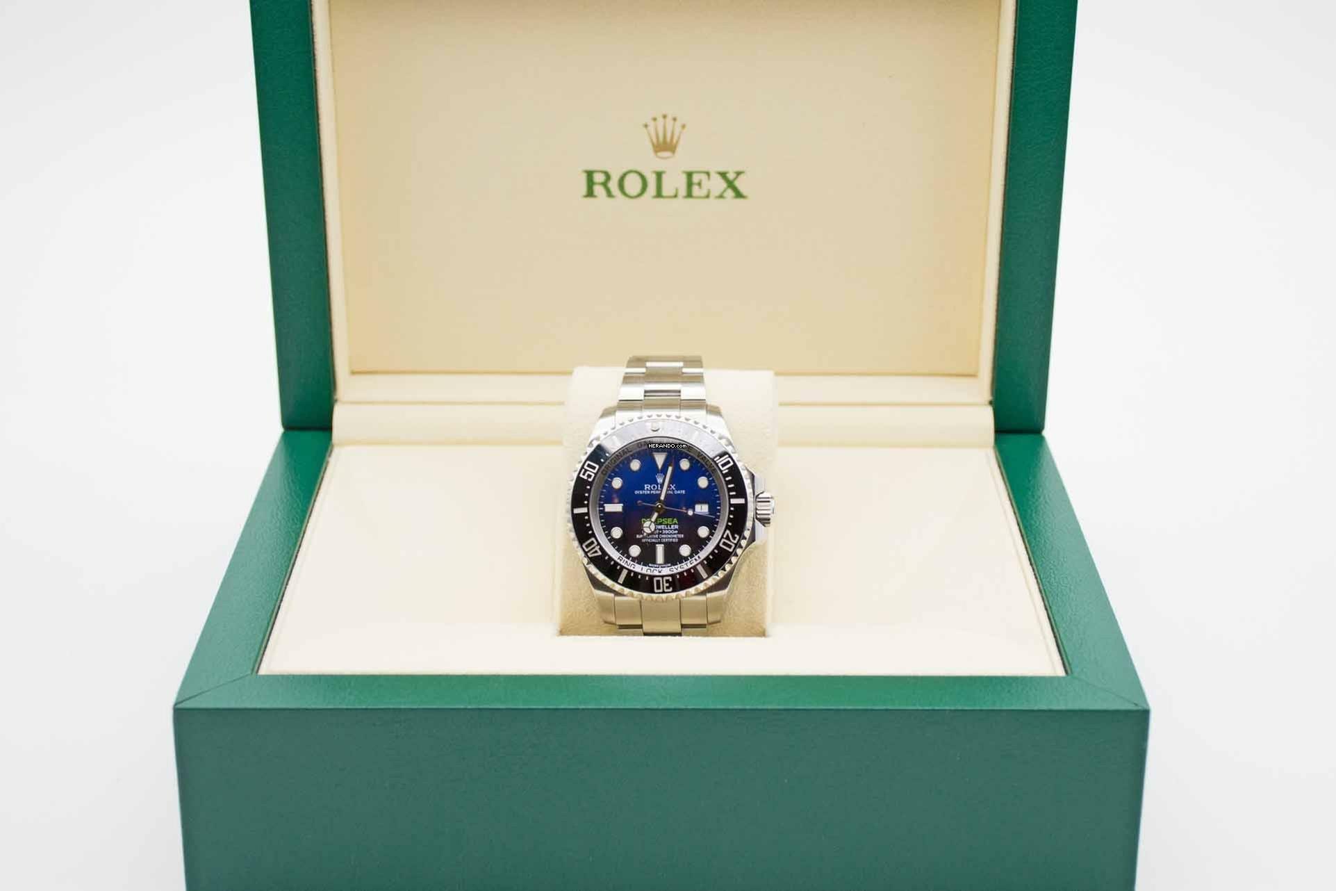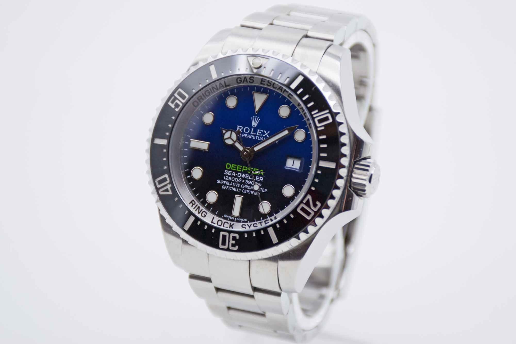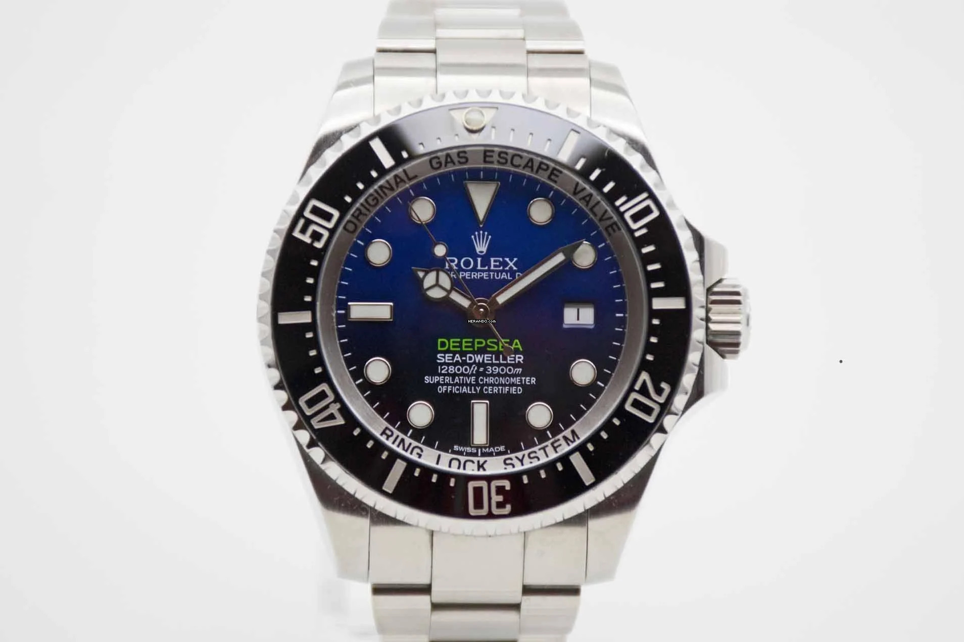Sea-Dweller Deepsea Blue 116660 James Cameron Edition, 44 mm Gehäuse mit blau/schwarzem Cameron Zifferblatt, Keramik Lünette und satiniertem Oysterarmband. Perfektes Fullset in Rolex Box mit Umkarton und Schuber, Sea-Dweller Anleitung, Garantie Booklet, Hang Tag, Preisschild mitpassender Gehäuse Nr., grünem Lederetui, Lünettenschutzring und Rolex Garantiekarte aus 2015. Die Uhr stammt aus Erstbesitz und befindet sich in perfektem und neuwertigem Zustand. Inzahlungnahmen sind nur im Direktgeschäft möglich. Bitte sprechen Sie uns hierzu an. Sea-Dweller Deepsea Blue 116660 James Cameron Edition, 44 mm case with blue/black dial, ceramic bezel and Rolex Oyster bracelet. Perfect full set in Rolex inner and outer box with cover, Sea-Dweller manual, green leather wallet, warranty booklet, hang tag, price tag with matching case no., bezel protector and Rolex warranty card from 2015. The watch comes from the first owner and is in perfect and mint condition like new. Trades are possible. Please keep in mind that our complete inventory is stored in our bank safe for safety purposes.