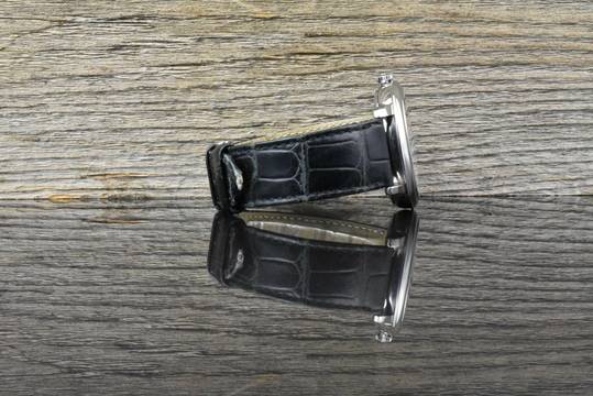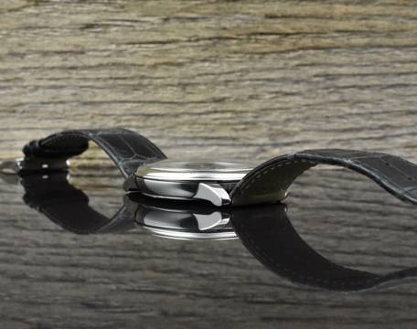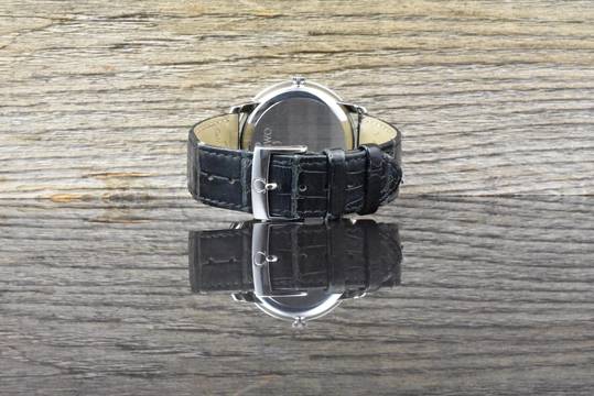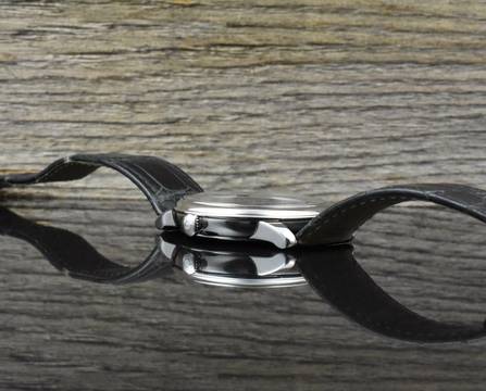 Armband: getragenes schwarzes Omega Lederarmband & Stahl Dornschließe