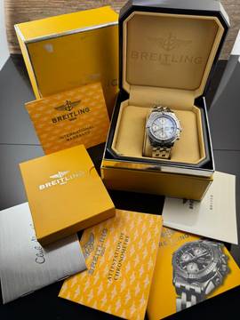 Lieferumfang: schwarze Breitling Bakelit Box mit Überkarton (sehr selten im guten Zustand) & Breitling Garantie Zertifikat aus ca. dem Jahr 2004, Chronometer Zertifikat, Gebrauchsanleitung, diverse Breitling Booklets und eine gelbe Unterlagenbox