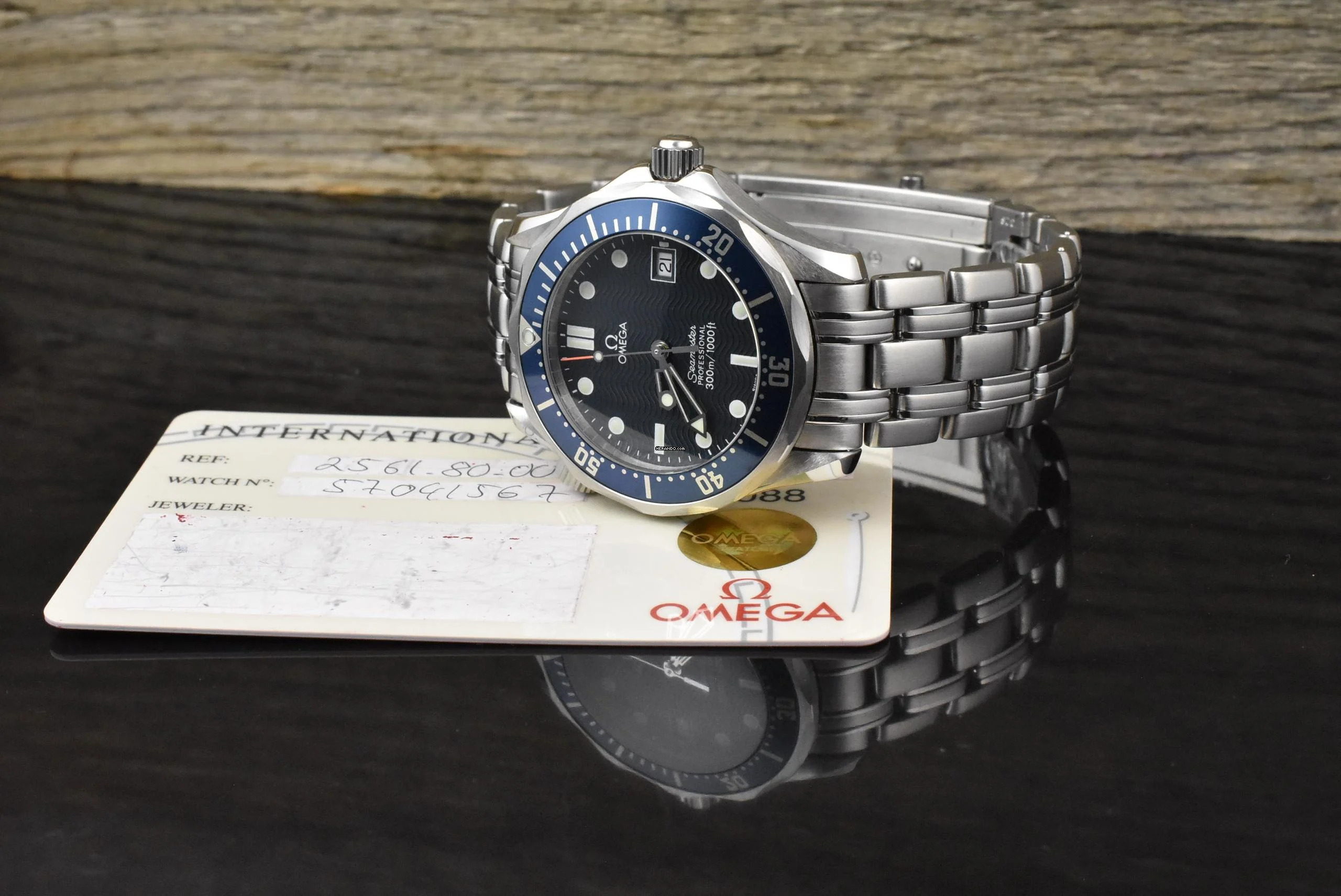 IKAN hier gibt es die Uhr, an alle Freunde des guten Geschmacks! Angeboten wird eine sehr schöne Vintage Seamaster Diver 300M Quarz James Bond Reverenz 2561.80.00 in Stahl aus ca. dem Jahr 1998 – Omega Vintage Zertifikat!