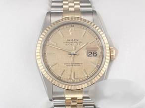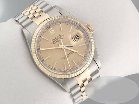 Diese wunderschöne Rolex ist aus Edelstahl in Kombination mit feinstem Gelbgold 750 gefertigtFantastisches und sehr seltenes champagnerfarbenes Tapestry-Zifferblatt mit großen goldenen Stabindices und kleinen römischen Zahlen