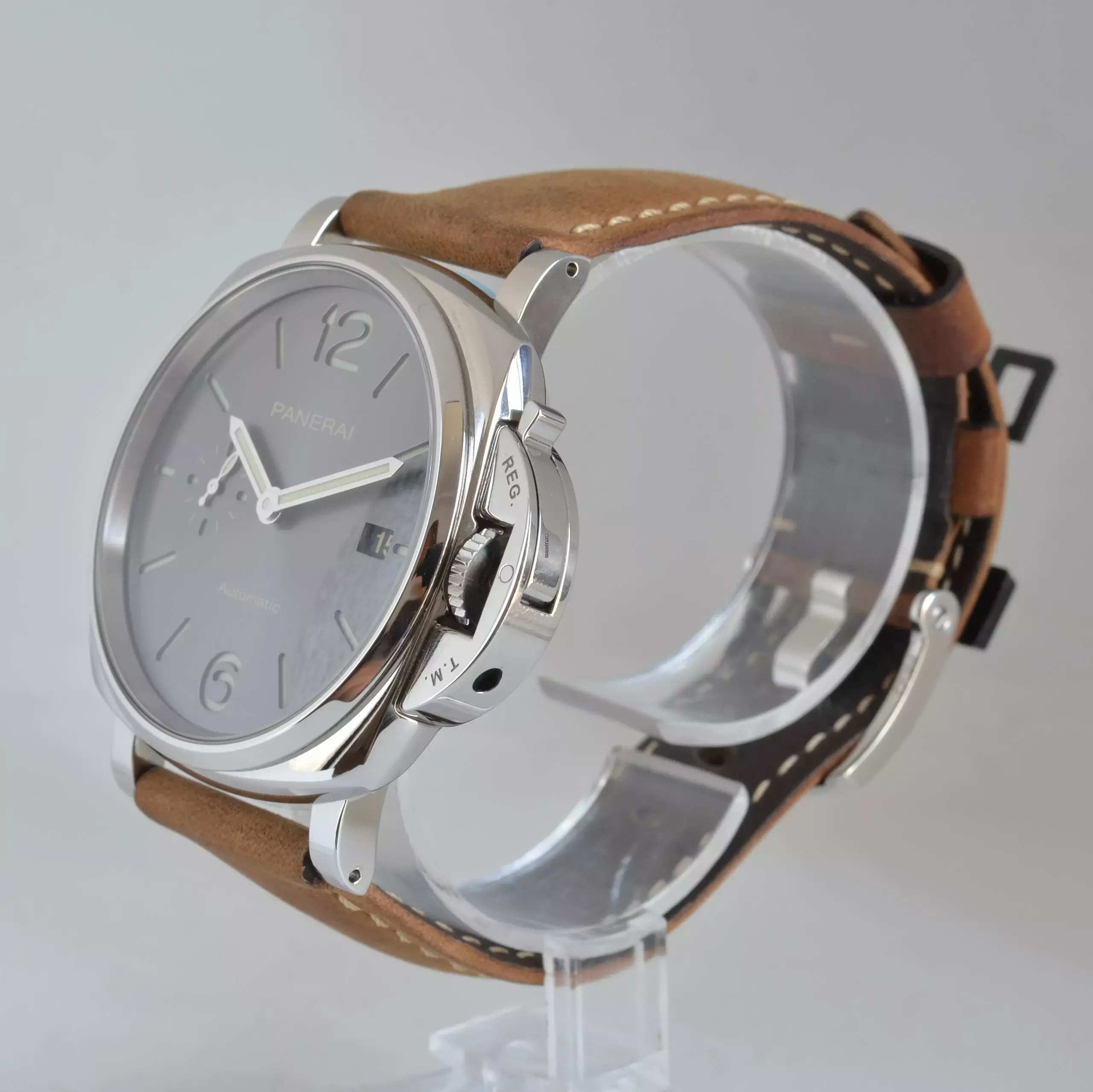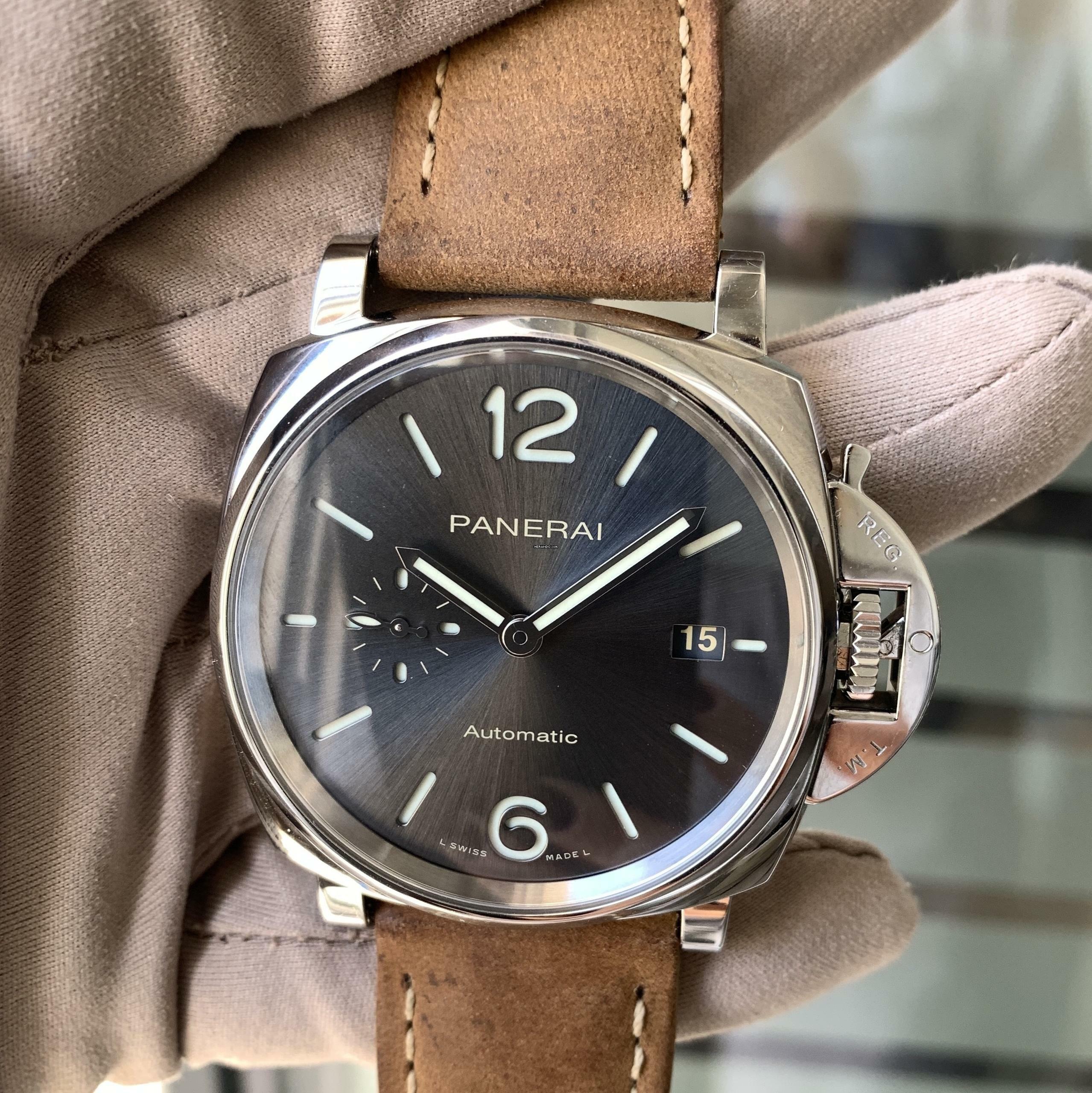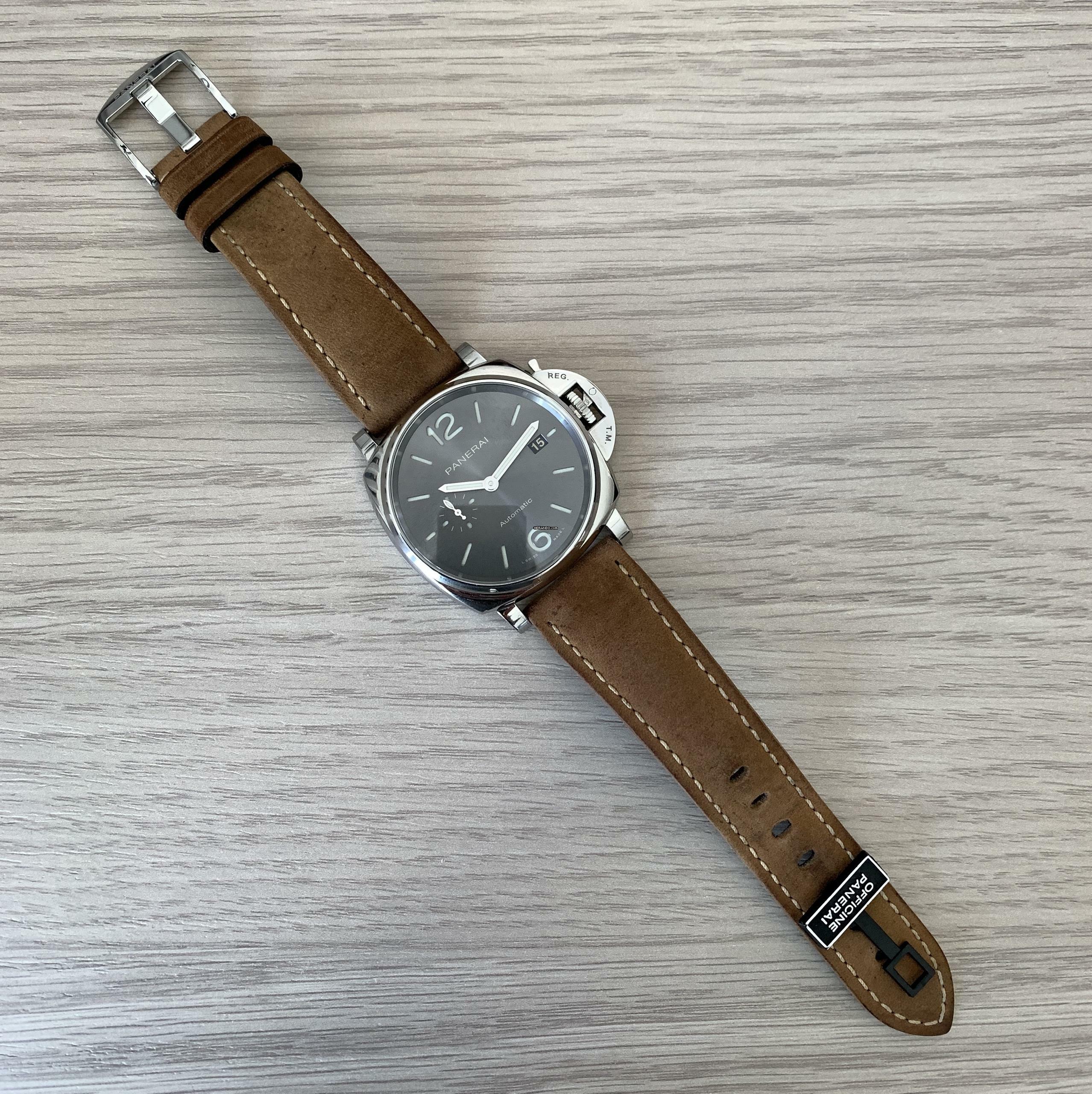 Panerai Luminor Due PAM00904 42MM steel, year of production 2020, smooth steel bezel, anti-reflective sapphire glass, slate gray dial with indexes and hands to LumiNova, automatic winding mechanical movement, brown colour suede calfskin strap with original Panerai steel buckle.