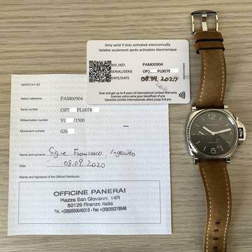 Warranty: Official Panerai – Country Italy – 08 September 2020 valid for 8 years