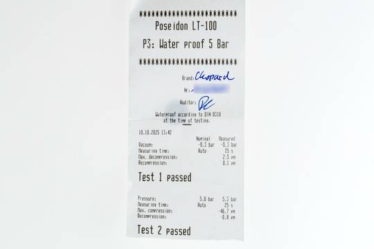 * Wenn die Uhr positiv auf Wasserdichtigkeit getestet wurde, dann gilt diese Eigenschaft zum Zeitpunkt der Messung. Wasserdichtigkeit ist nach DIN 8310 keine bleibende Eigenschaft. Sie sollte jährlich und vor besonderen Belastungen überprüft werden, da die eingebauten Dichtelemente in ihrer Funktion und im täglichen Gebrauch nachlassen. Einflüsse wie starke Temperaturschwankungen, Chlor, Seife oder Salzwasser wirken sich negativ auf die Wasserdichtigkeit aus.
