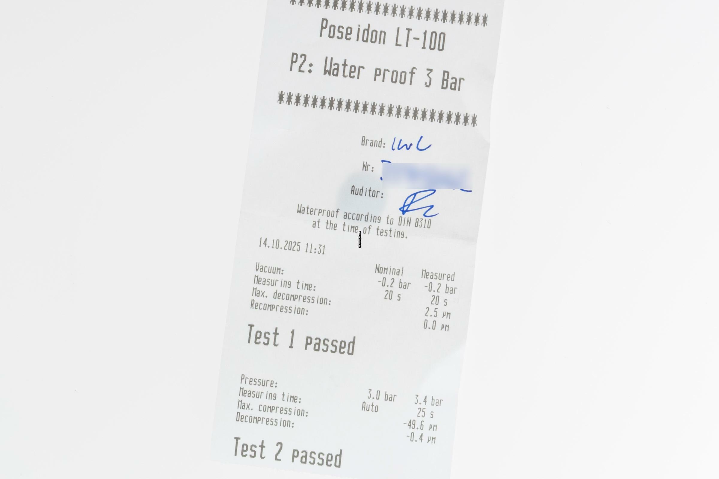 - Wasserdichtigkeit*: ja. Das Prüfprotokoll mit Prüfdruckangabe liegt bei.