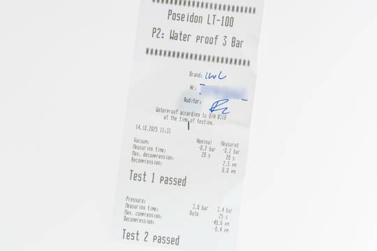 * Wenn die Uhr positiv auf Wasserdichtigkeit getestet wurde, dann gilt diese Eigenschaft zum Zeitpunkt der Messung. Wasserdichtigkeit ist nach DIN 8310 keine bleibende Eigenschaft. Sie sollte jährlich und vor besonderen Belastungen überprüft werden, da die eingebauten Dichtelemente in ihrer Funktion und im täglichen Gebrauch nachlassen. Einflüsse wie starke Temperaturschwankungen, Chlor, Seife oder Salzwasser wirken sich negativ auf die Wasserdichtigkeit aus.