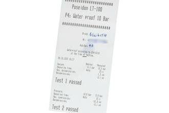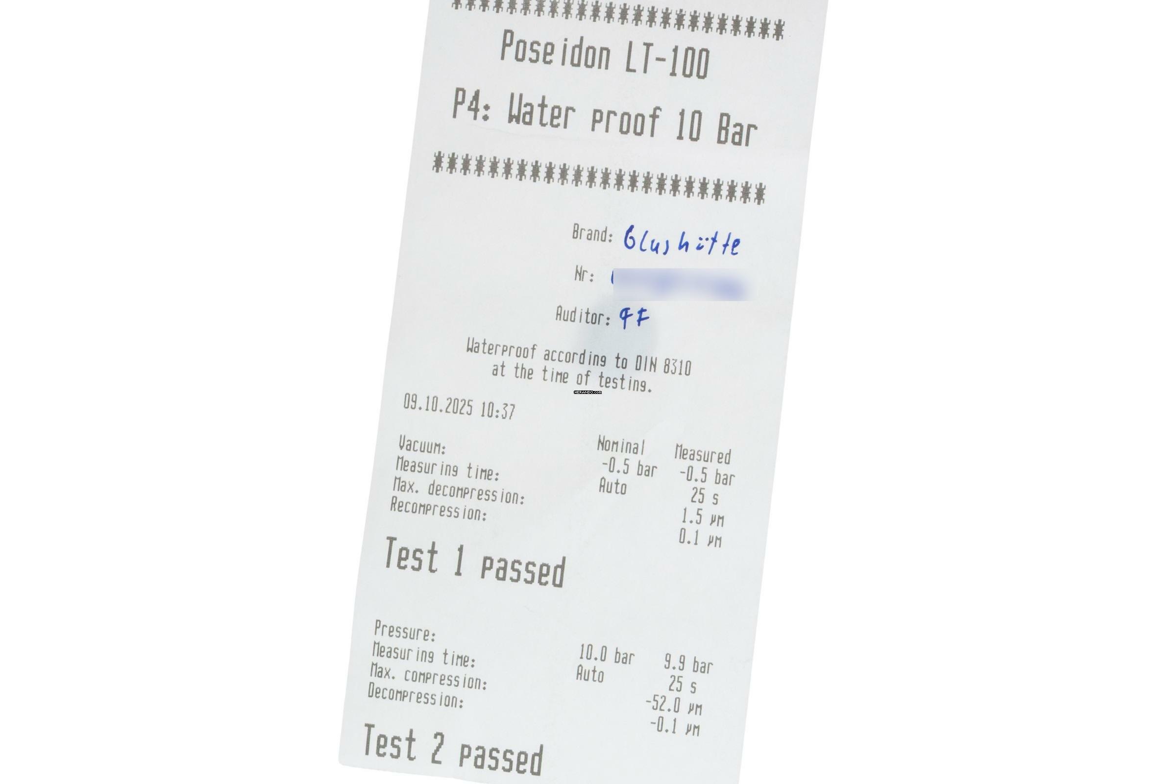 - Wasserdichtigkeit*: ja. Das Prüfprotokoll mit Prüfdruckangabe liegt bei.