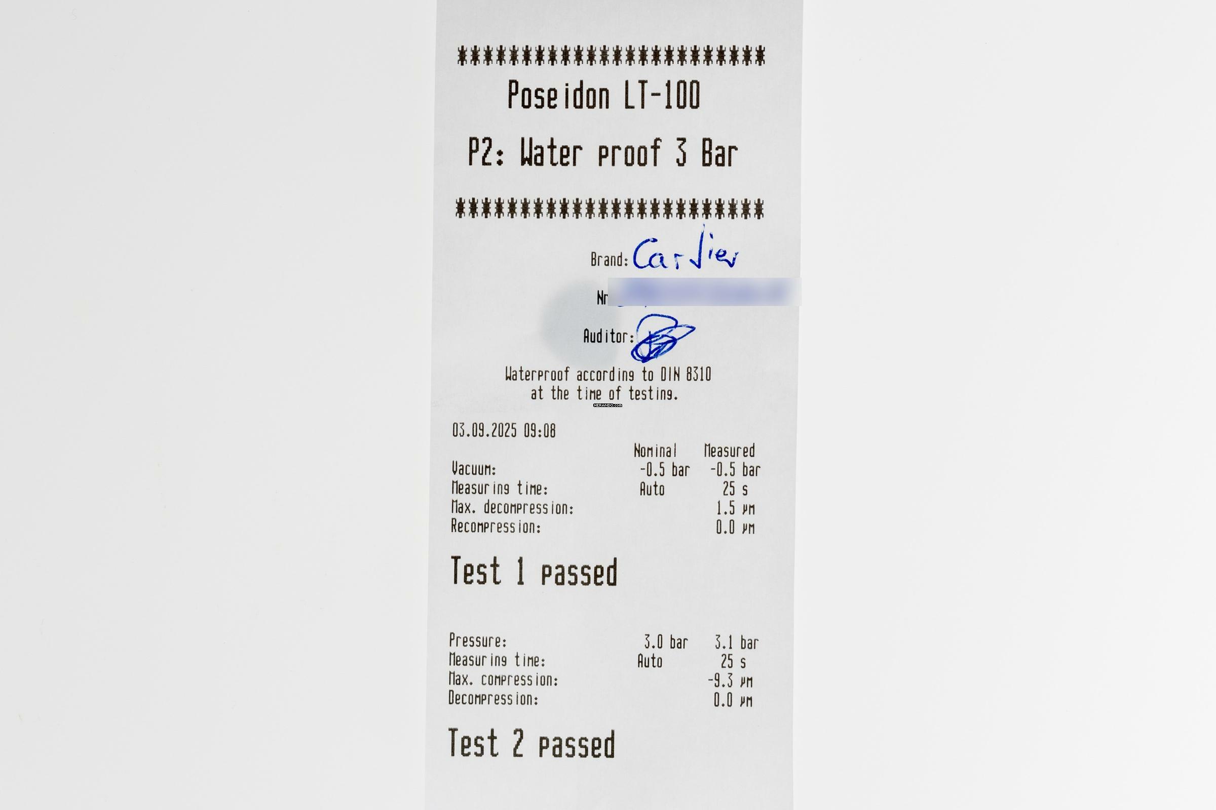 - Wasserdichtigkeit*: ja. Das Prüfprotokoll mit Prüfdruckangabe liegt bei.