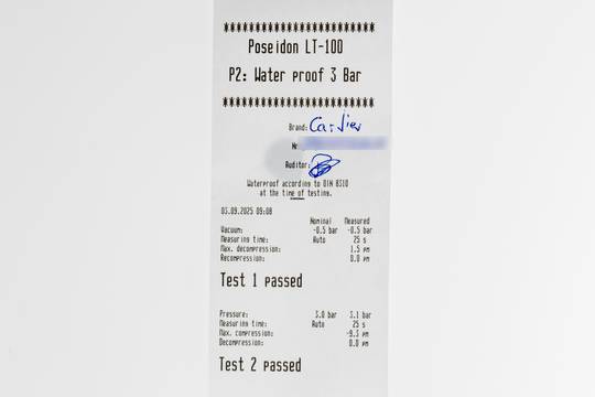 * Wenn die Uhr positiv auf Wasserdichtigkeit getestet wurde, dann gilt diese Eigenschaft zum Zeitpunkt der Messung. Wasserdichtigkeit ist nach DIN 8310 keine bleibende Eigenschaft. Sie sollte jährlich und vor besonderen Belastungen überprüft werden, da die eingebauten Dichtelemente in ihrer Funktion und im täglichen Gebrauch nachlassen. Einflüsse wie starke Temperaturschwankungen, Chlor, Seife oder Salzwasser wirken sich negativ auf die Wasserdichtigkeit aus.