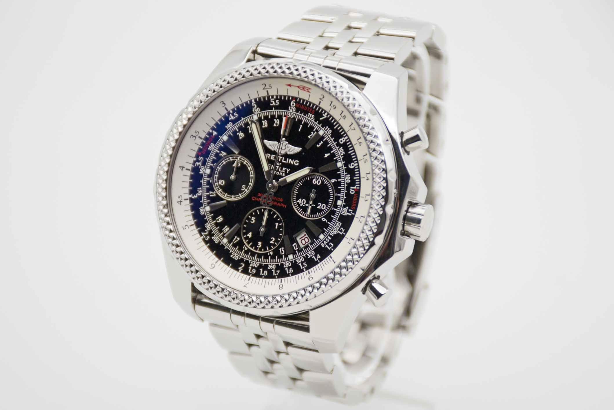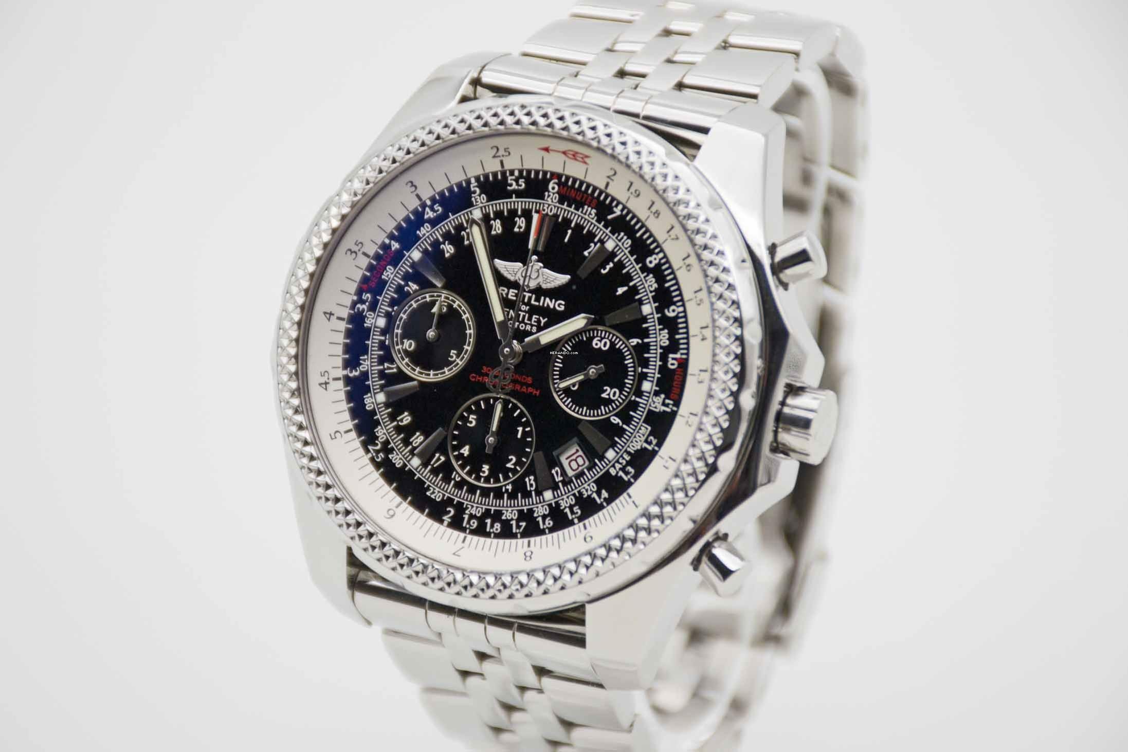 Breitling Bentley Motors Chronograph A25362, 48 mm Edelstahl Gehäuse mit schwarzem Zifferblatt und Breitling Edelstahl Armband (Armumfang bis 19,2 cm). Wunderschöner Chronograph in Breitling for Bentley Box mit grünem Umkarton (mit Lagerspuren am Inlay), Breitling for Bentley Etui, Breitling Service Booklet, Rechenschieber, Wempe Wertgutachten und Breitling Garantiezertifikat aus 2010. Die Uhr befindet sich in perfektem und frisch gewartetem Zustand. Inzahlungnahmen sind nur bei direktem Kontakt möglich.