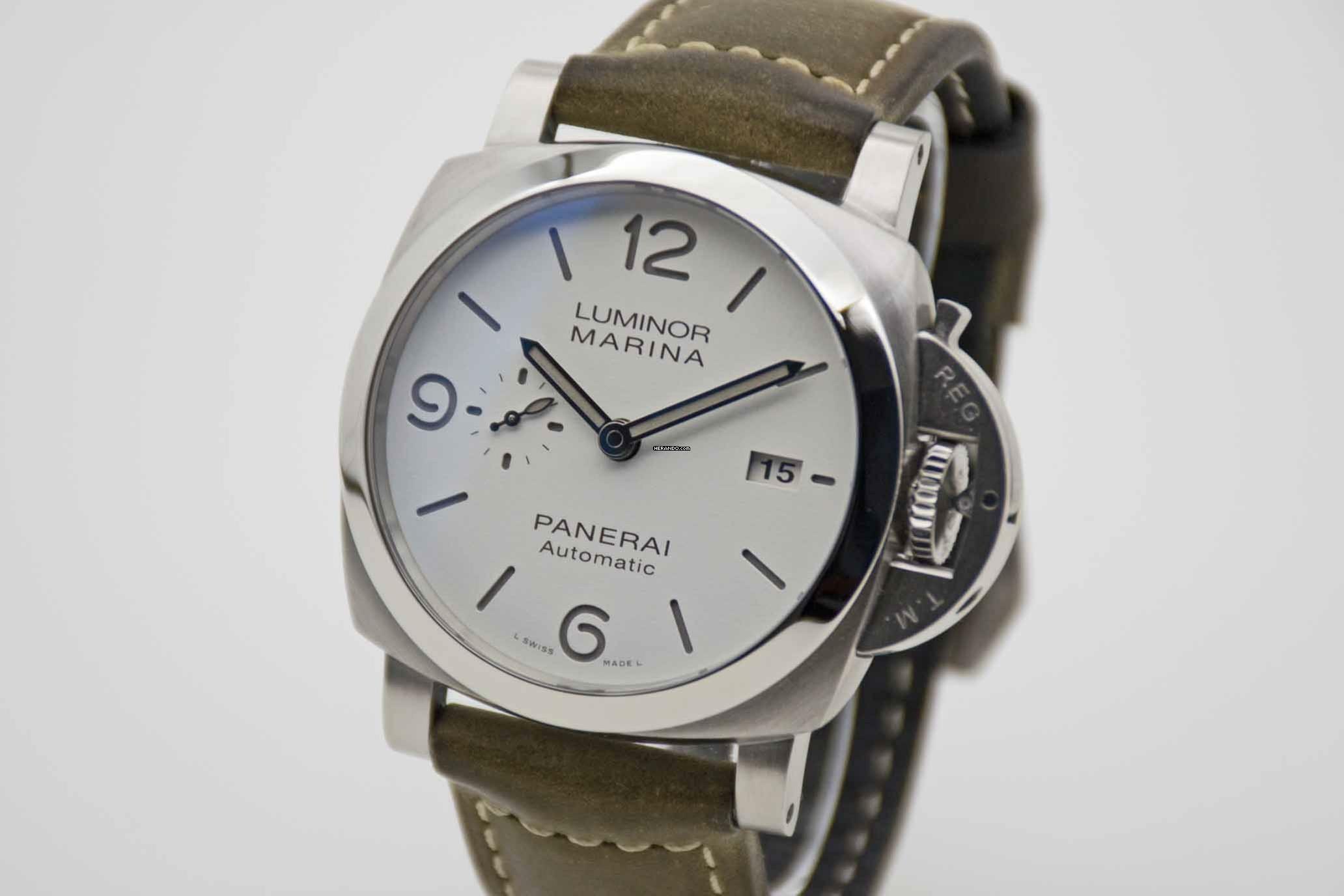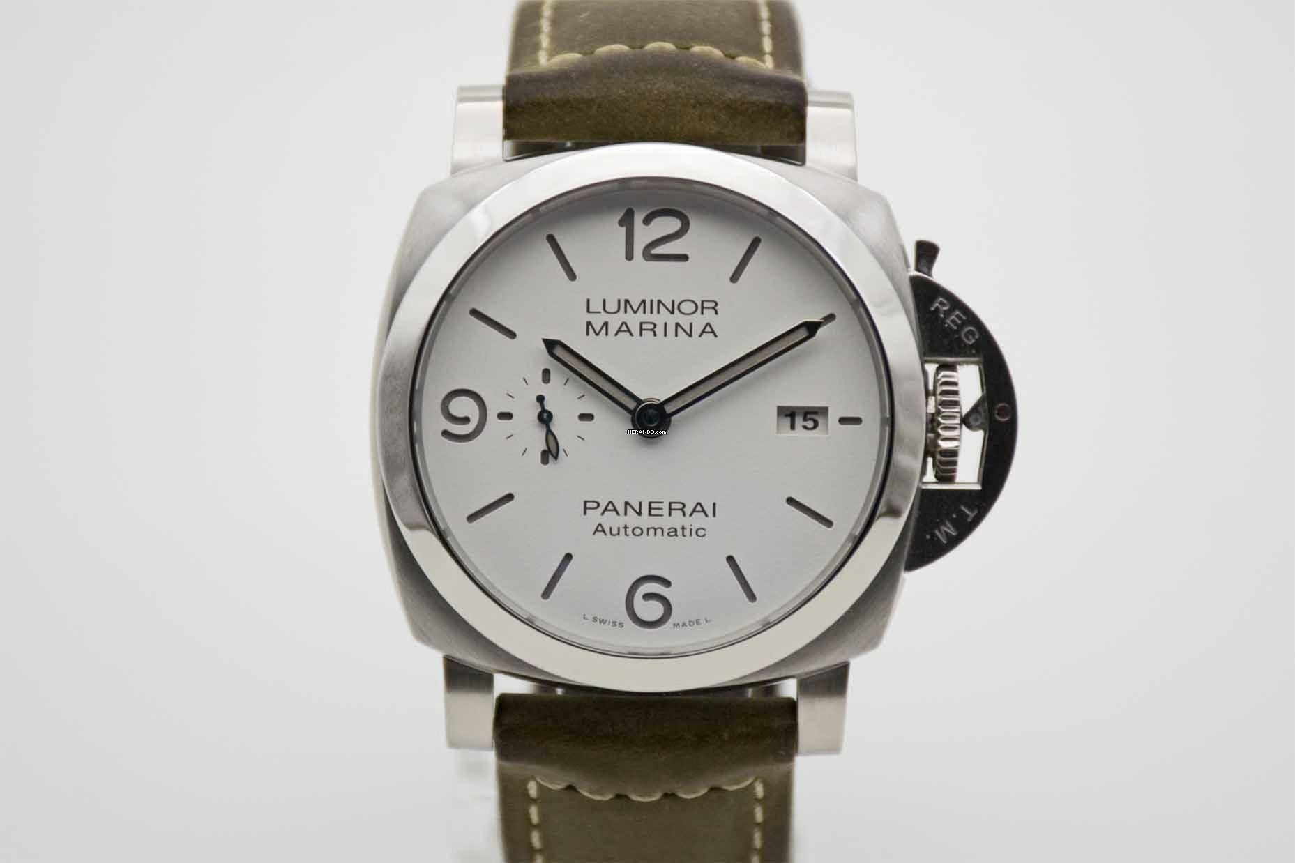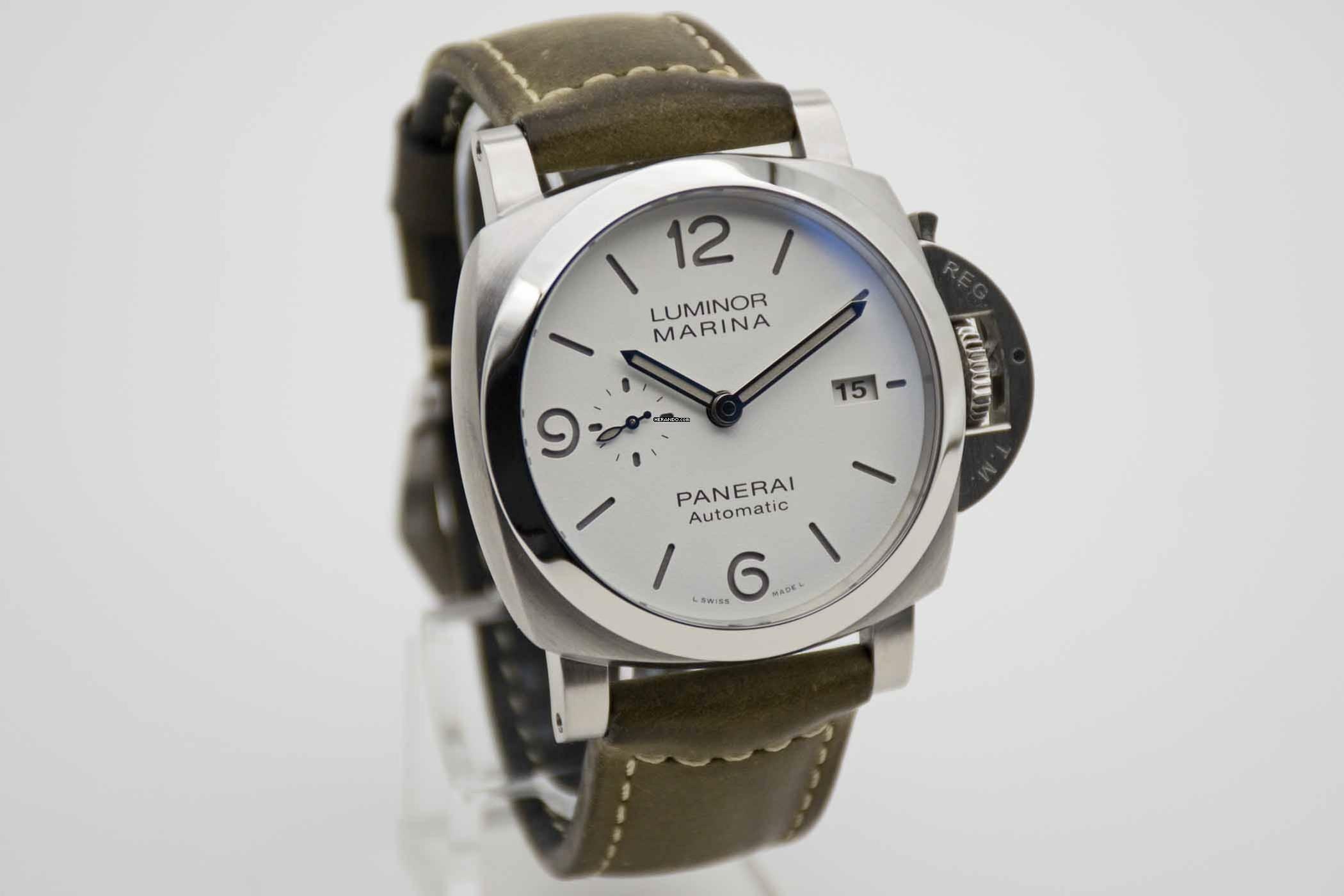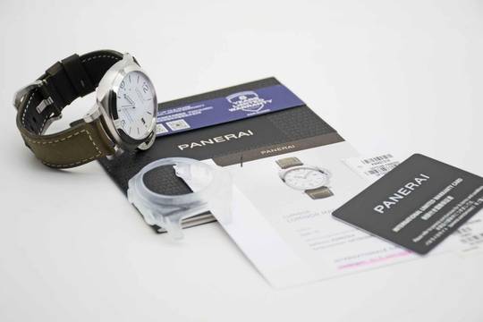 Luminor Marina PAM01314, 44 mm Gehäuse mit weißem Sandwich Zifferblatt und grünem Panerai Lederarmband mit Panerai Dornschließe. Perfektes Fullset in Panerai Box mit Umkarton, Lünettenschutz, Gebrauchsanweisung, Garantiebooklet, Panerai Ersatzarmband, Werzeug, Referenz Sticker, Panerai Garantieverlängerung bis 2030 und Panerai Garantiekarte aus 2022. Klassischer Diver im perkekten Sammler Zustand. Inzahlungnahmen sind nur im Direktgeschäft möglich. Zu unserer Sicherheit lagern wir sämtliche Uhren unseres Bestandes extern im Banksafe, daher bitten wir um vorherige Terminvereinbarung. Luminor Marina PAM01314, 44 mm case with white sandwich dial and green Panerai leather strap with Panerai buckle. Fullset in Panerai inner and outer box with warranty booklet, manual, bezel protector, reference stickers, tools, extra Panerai strap, extended Panerai warranty (valid up to 2030) and Panerai warranty card from 2022. The watch comes from a collector and is in perfect and mint condition like new. Trades are possible, please call us for a quote. Keep in mind that our complete inventory is stored in our bank safe for safety purposes.
