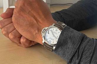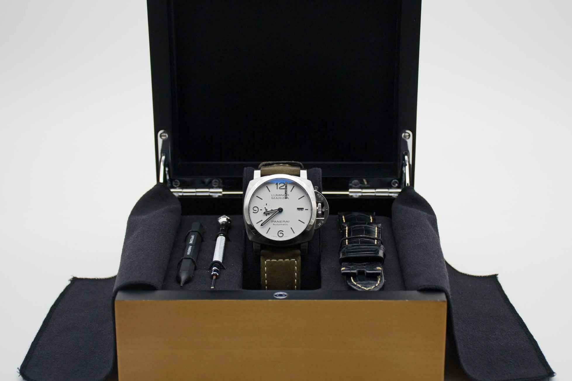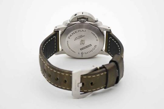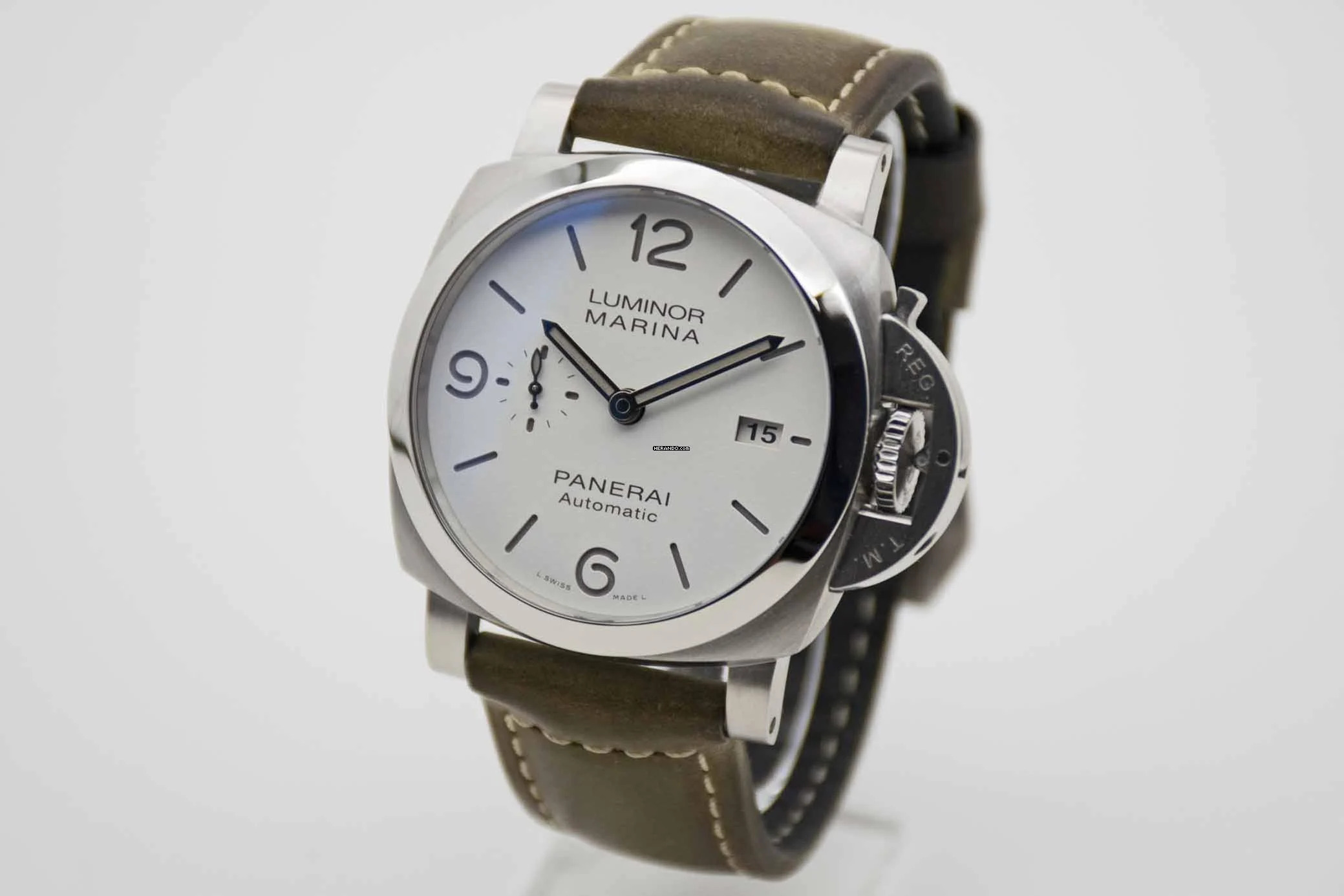 Luminor Marina PAM01314, 44 mm Gehäuse mit weißem Sandwich Zifferblatt und grünem Panerai Lederarmband mit Panerai Dornschließe. Perfektes Fullset in Panerai Box mit Umkarton, Lünettenschutz, Gebrauchsanweisung, Garantiebooklet, Panerai Ersatzarmband, Werzeug, Referenz Sticker, Panerai Garantieverlängerung bis 2030 und Panerai Garantiekarte aus 2022. Klassischer Diver im perkekten Sammler Zustand. Inzahlungnahmen sind nur im Direktgeschäft möglich. Zu unserer Sicherheit lagern wir sämtliche Uhren unseres Bestandes extern im Banksafe, daher bitten wir um vorherige Terminvereinbarung. Luminor Marina PAM01314, 44 mm case with white sandwich dial and green Panerai leather strap with Panerai buckle. Fullset in Panerai inner and outer box with warranty booklet, manual, bezel protector, reference stickers, tools, extra Panerai strap, extended Panerai warranty (valid up to 2030) and Panerai warranty card from 2022. The watch comes from a collector and is in perfect and mint condition like new. Trades are possible, please call us for a quote. Keep in mind that our complete inventory is stored in our bank safe for safety purposes.