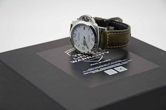 Luminor Marina PAM01314, 44 mm Gehäuse mit weißem Sandwich Zifferblatt und grünem Panerai Lederarmband mit Panerai Dornschließe. Perfekte Luminor in Panerai Box mit Umkarton, Panerai Ersatzarmband, Werzeug, Referenz Sticker, Lünettenschtz, Panerai Garantieverlängerung bis 2030 und Panerai Garantiekarte aus 2022. Klassischer Diver im perkekten Zustand. Inzahlungnahmen sind nur im Direktgeschäft möglich. Zu unserer Sicherheit lagern wir sämtliche Uhren unseres Bestandes extern im Banksafe, daher bitten wir um vorherige Terminvereinbarung.