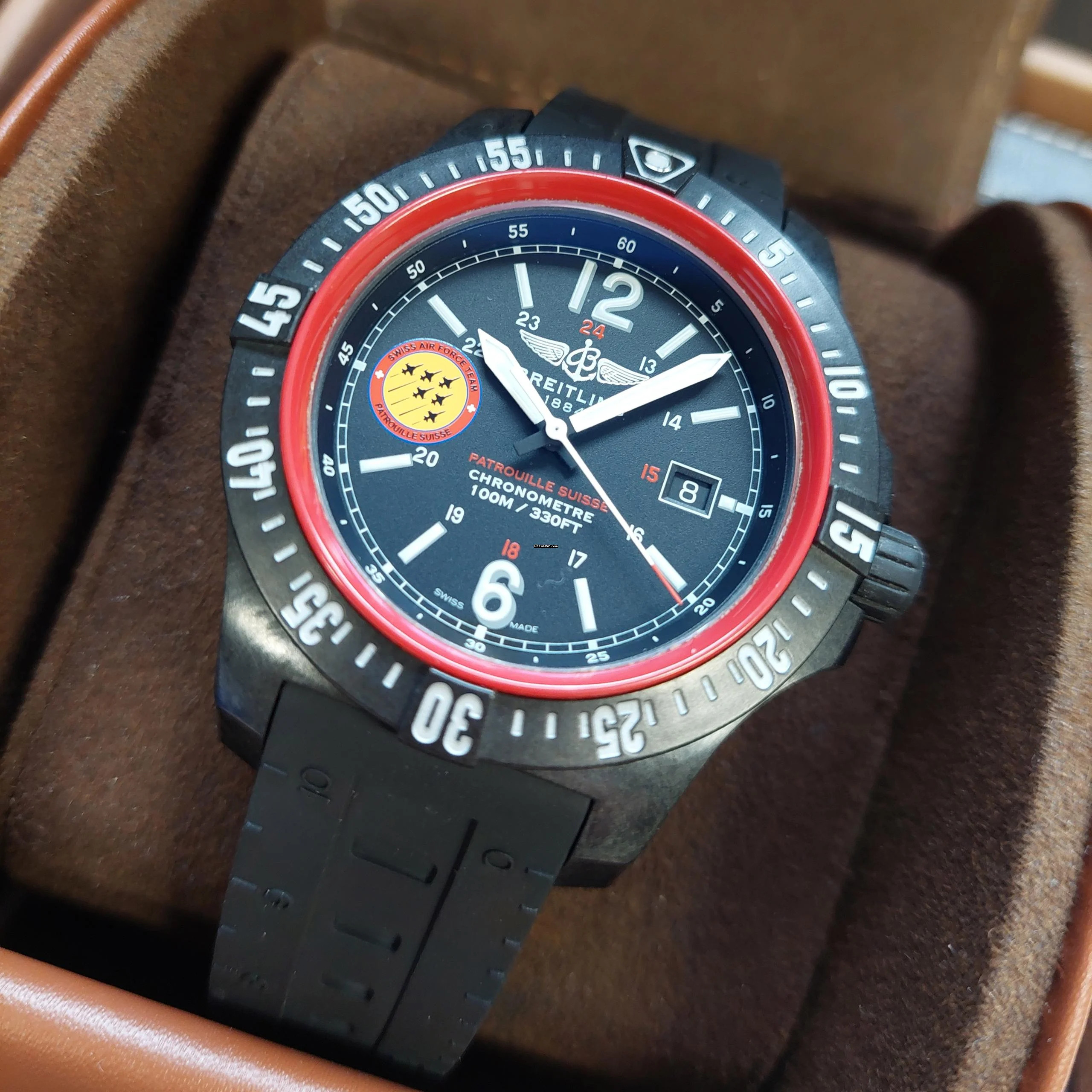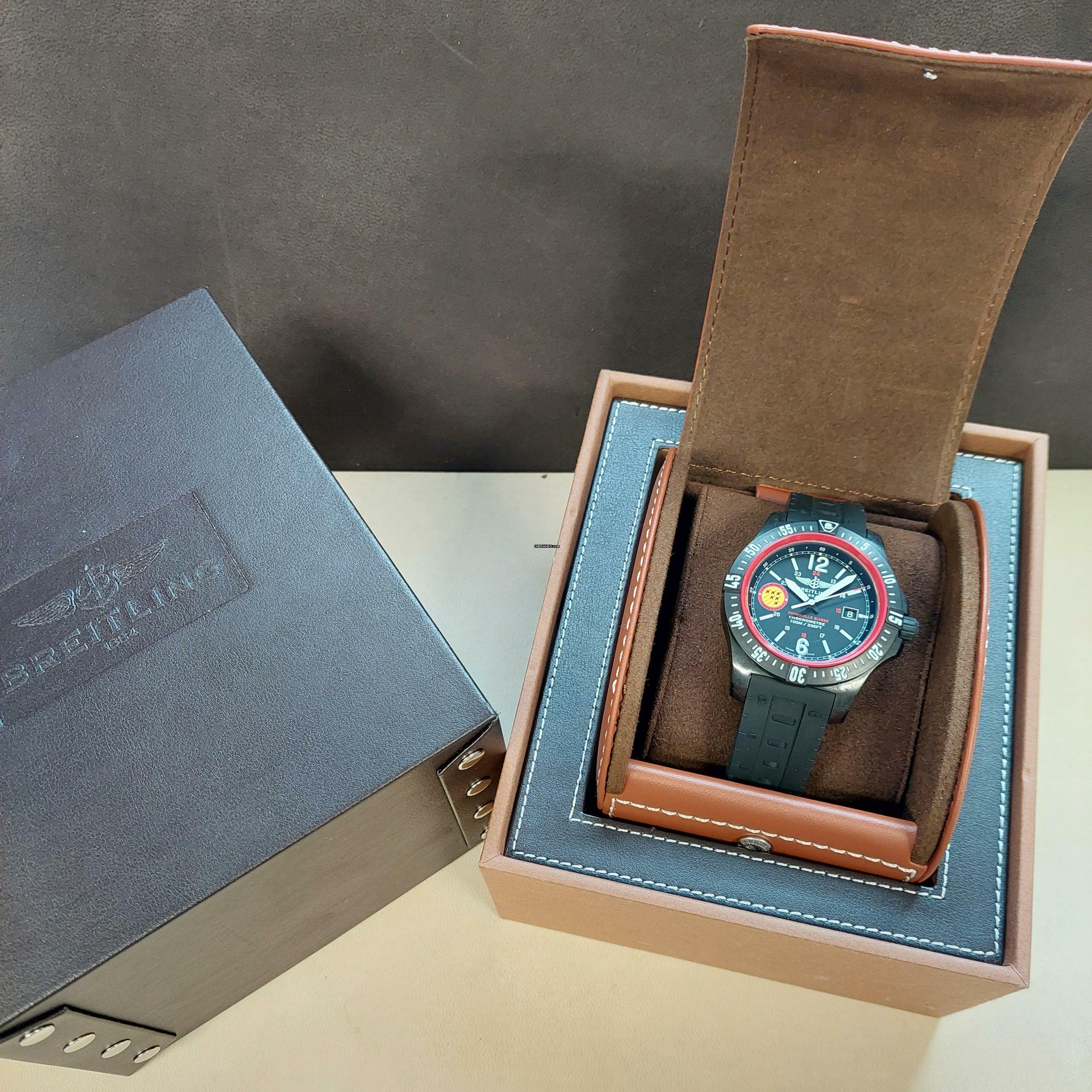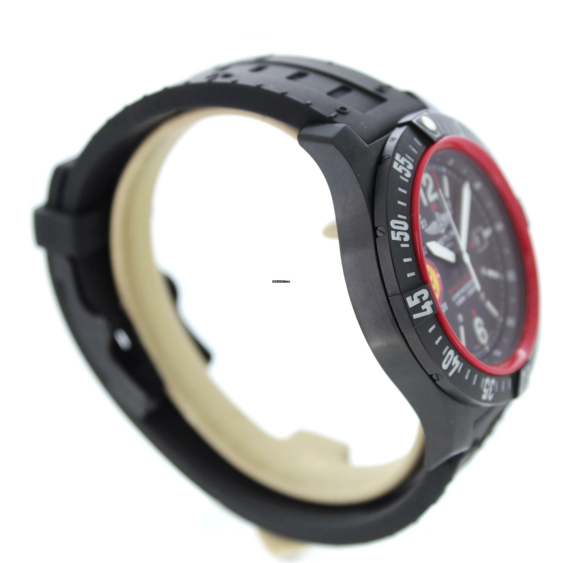 Diese Breitling Uhr verfügt über ein 45 mm Gehäuse. Die Uhr hat ein schwarzes Zifferblatt. Die Uhr ist mit einem schwarzen Kautschukband ausgestattet.