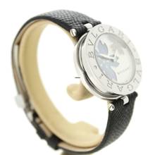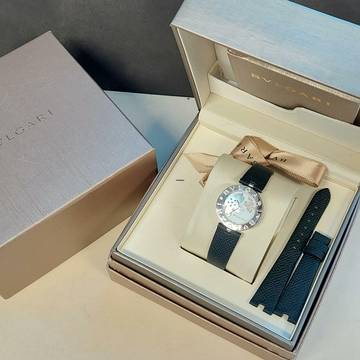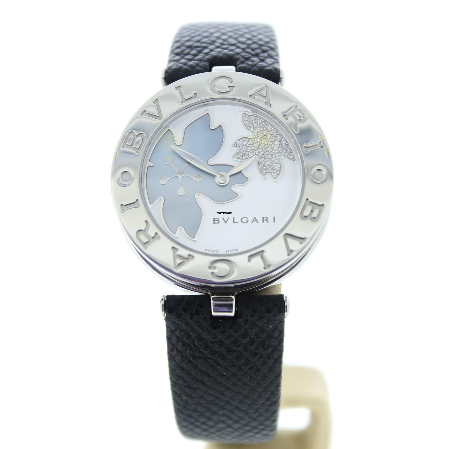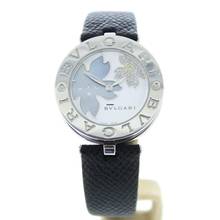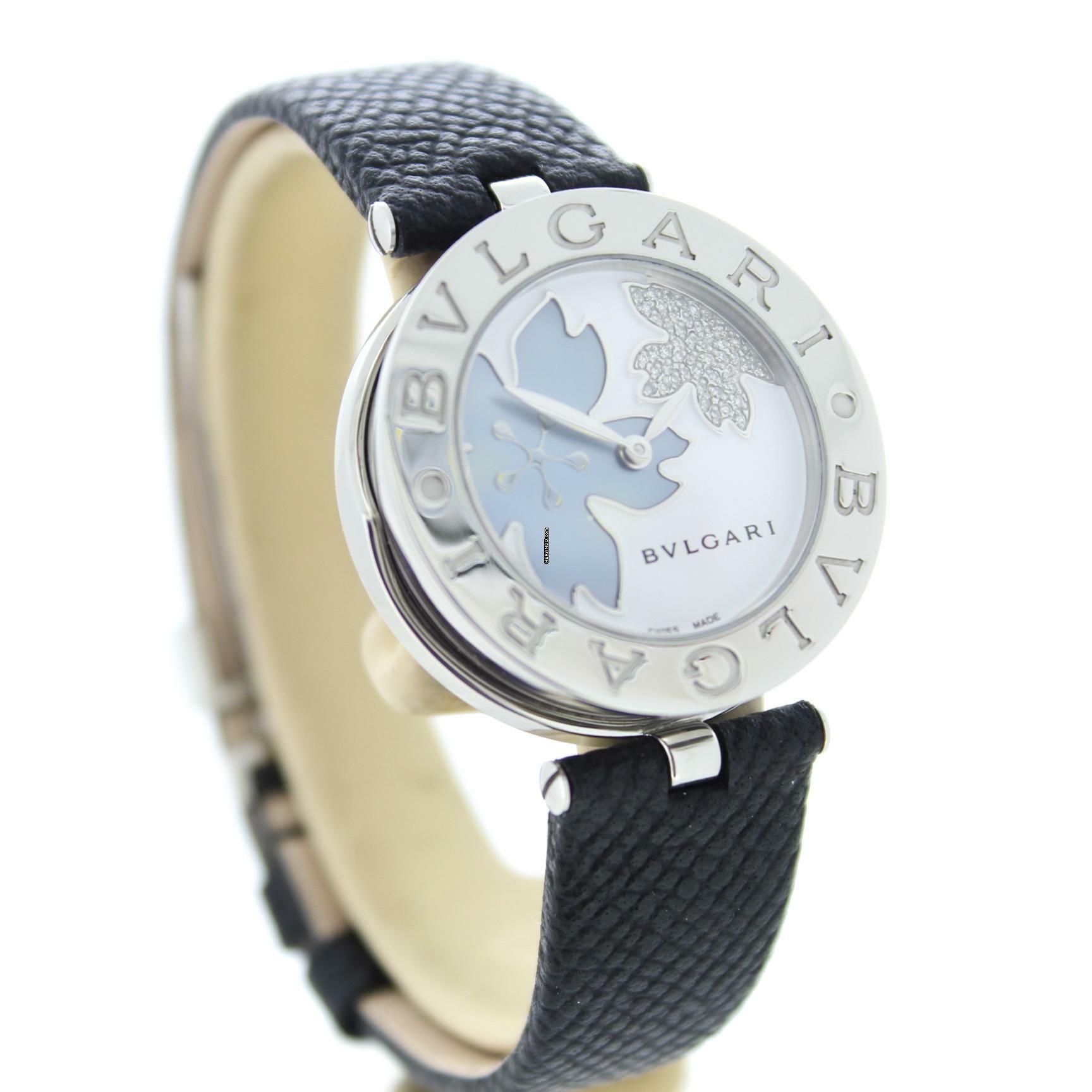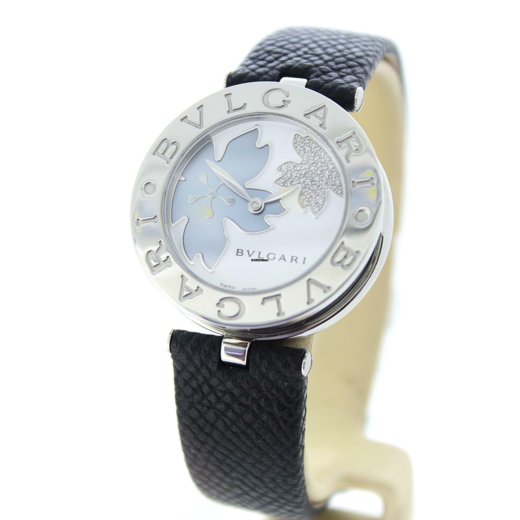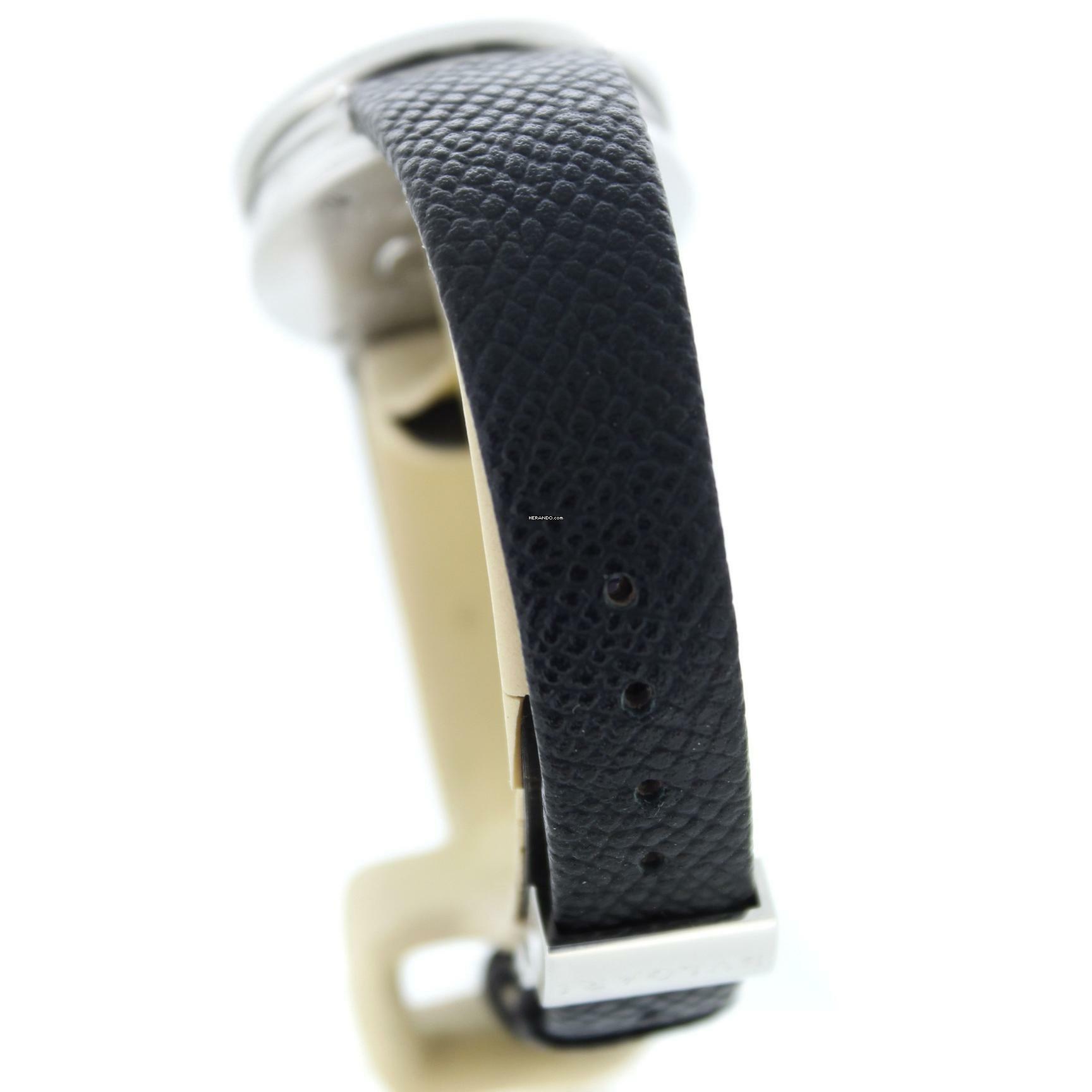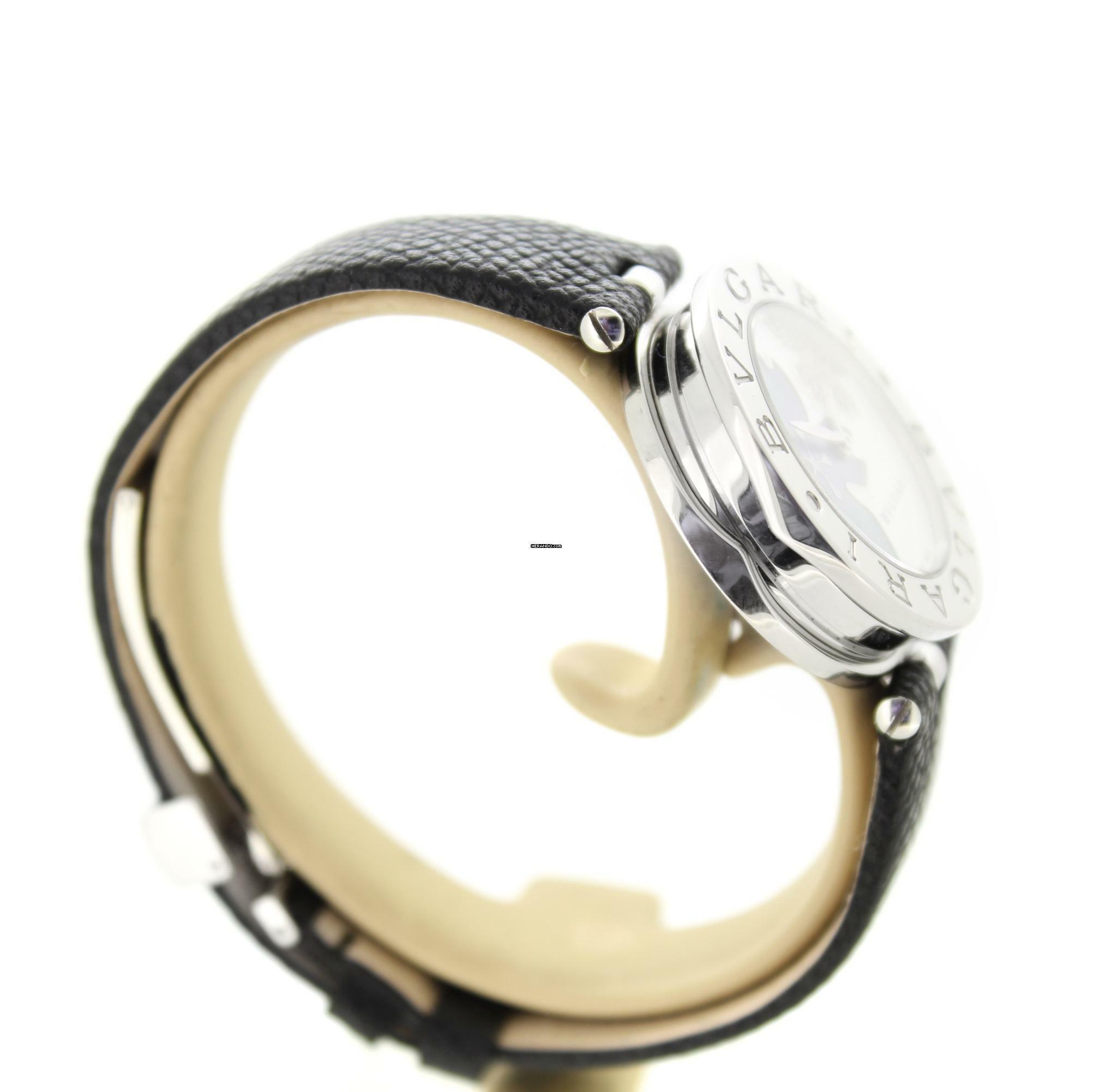 Diese Bulgari Uhr verfügt über ein 30mm Stahlgehäuse. Die Uhr hat ein weißes Zifferblatt. Die Uhr ist mit einem schwarzen Lederband ausgestattet.