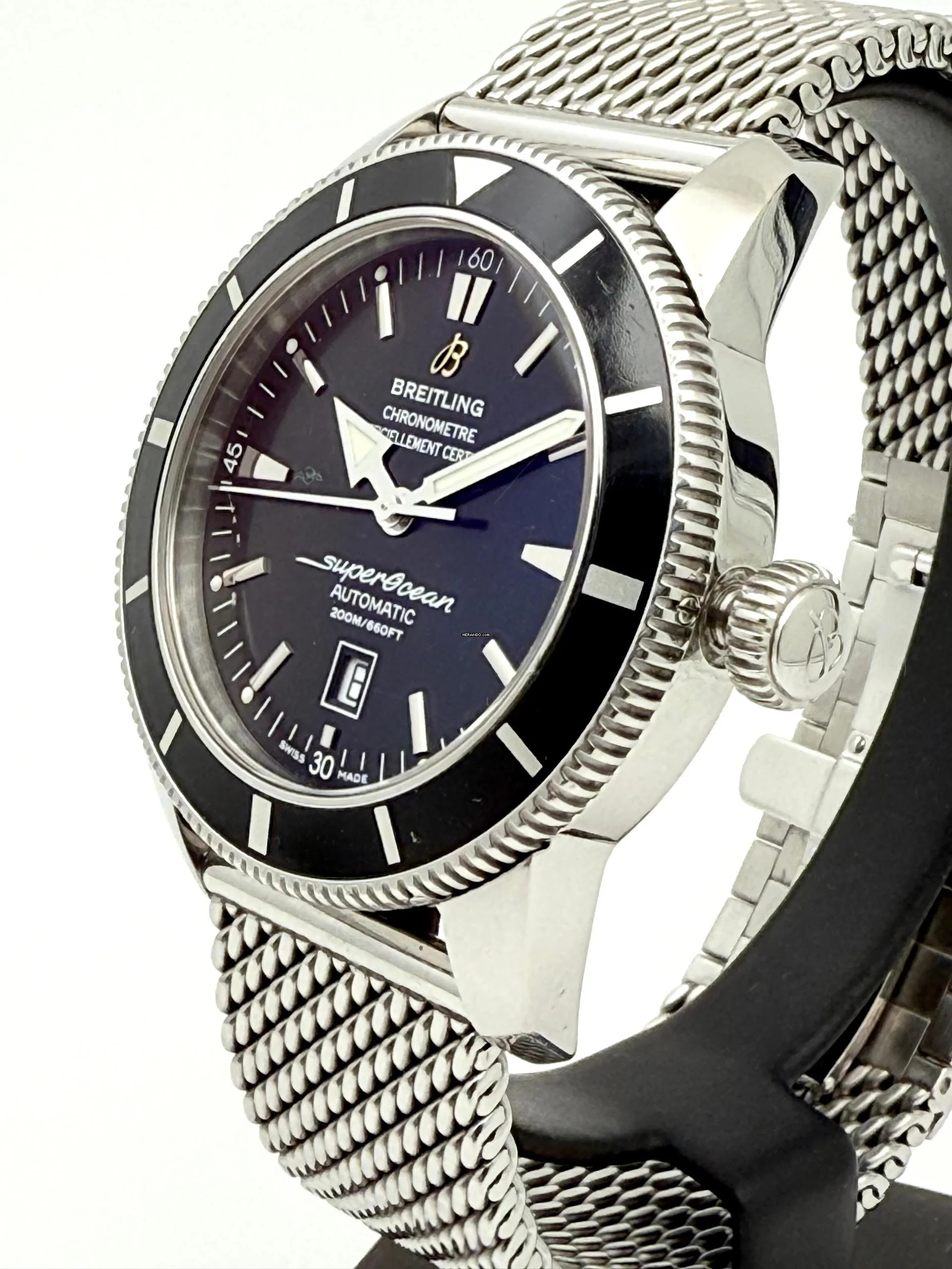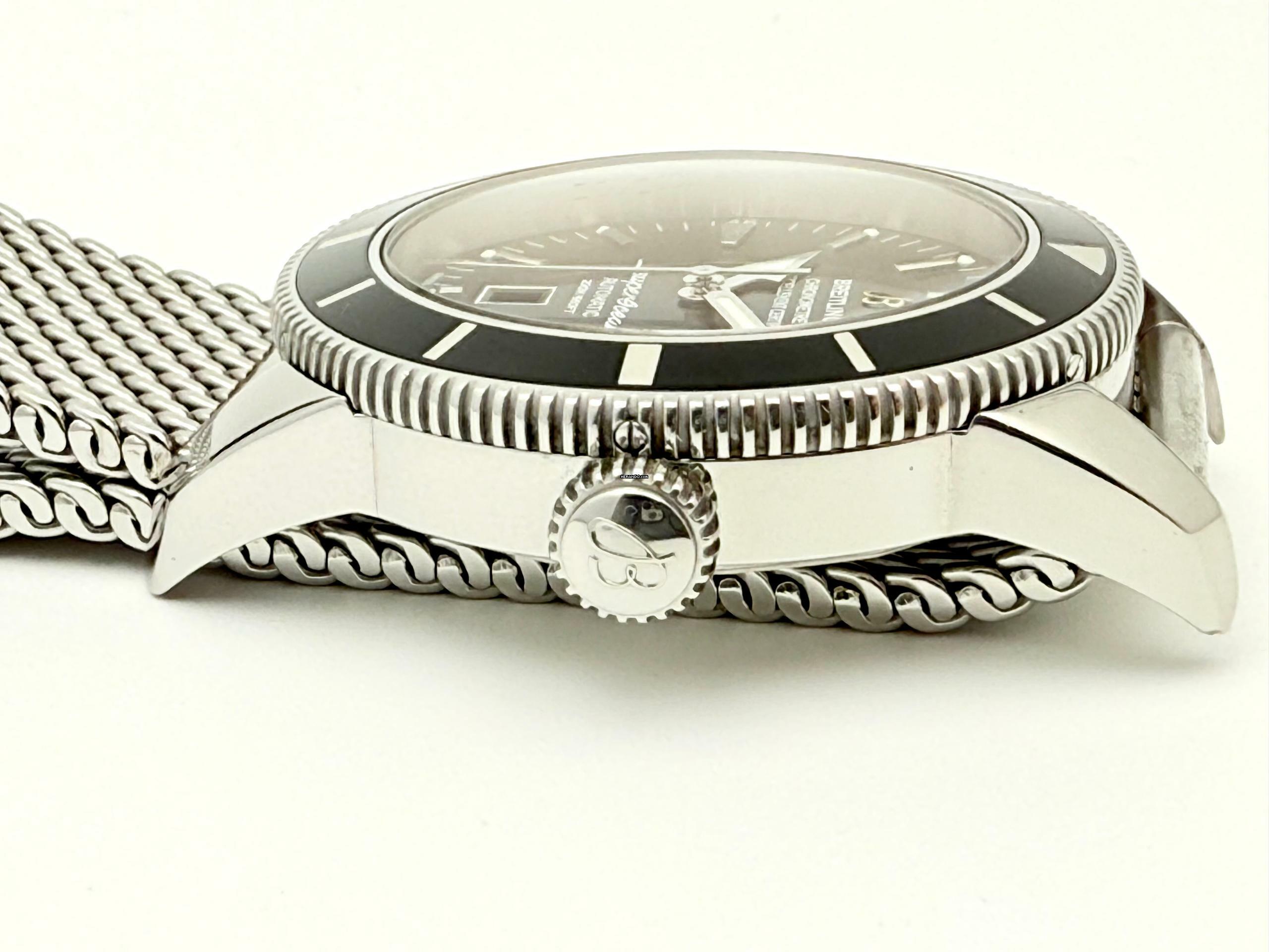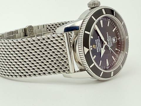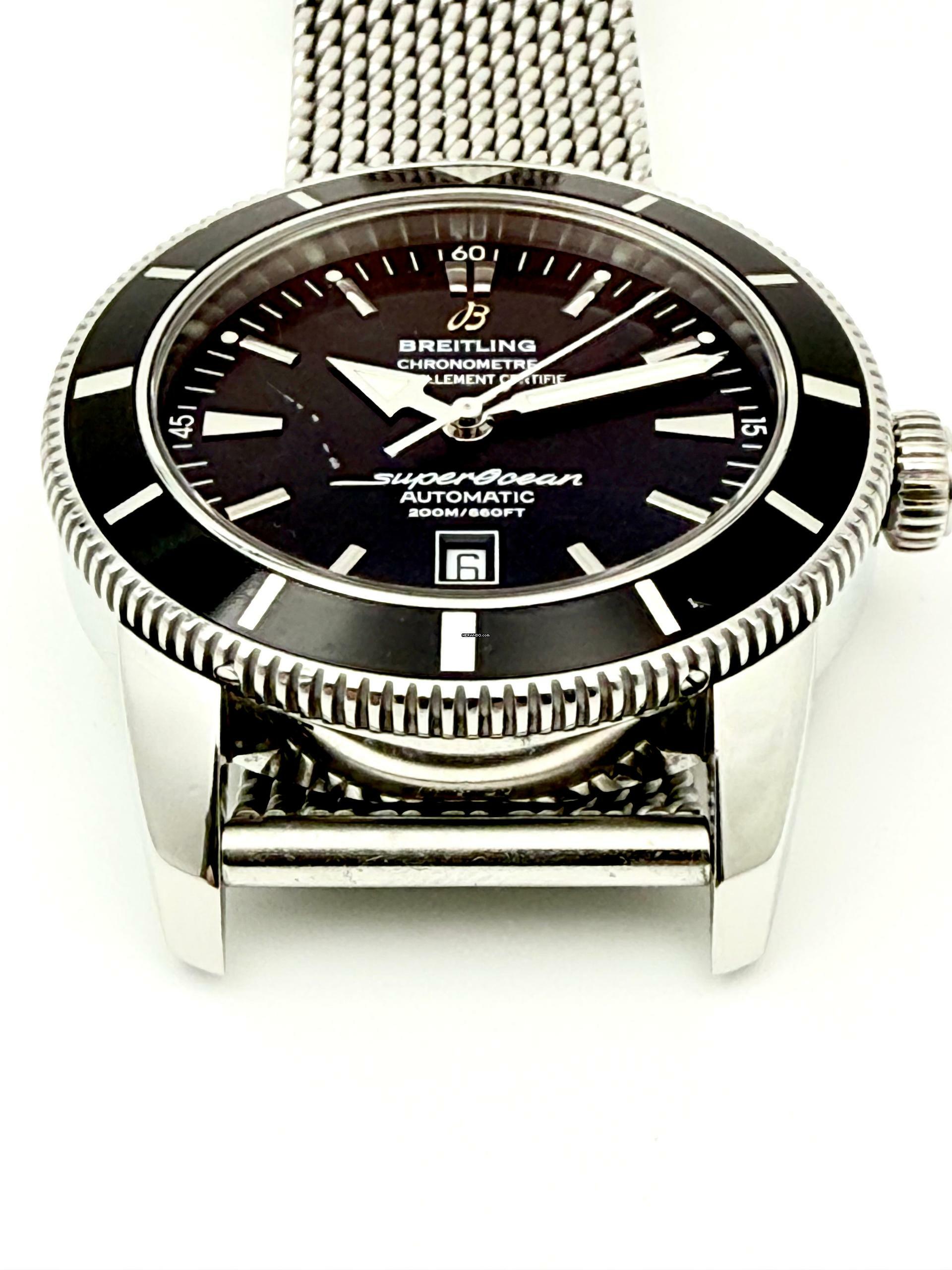 Zum Verkauf steht diese schöne Breitling Superocean Heritage 46 mm. in Stahl mit schwarzem Zifferblatt und schwarzer Stahllünette an einem Stahlband ( Stahlband ist nicht von Breitling ).
