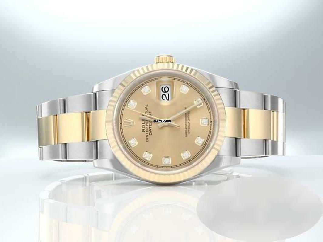 Diese einmalig-schöne und in dieser Ausführung sehr seltene Rolex ist aus Edelstahl in Kombination mit feinstem Gelbgold 750 gefertigtFantastisches champagnerfarbenes Zifferblatt mit 10 strahlenden Diamanten besetzt, original von Rolex