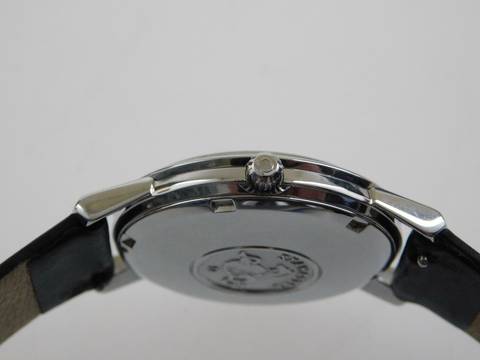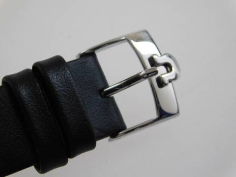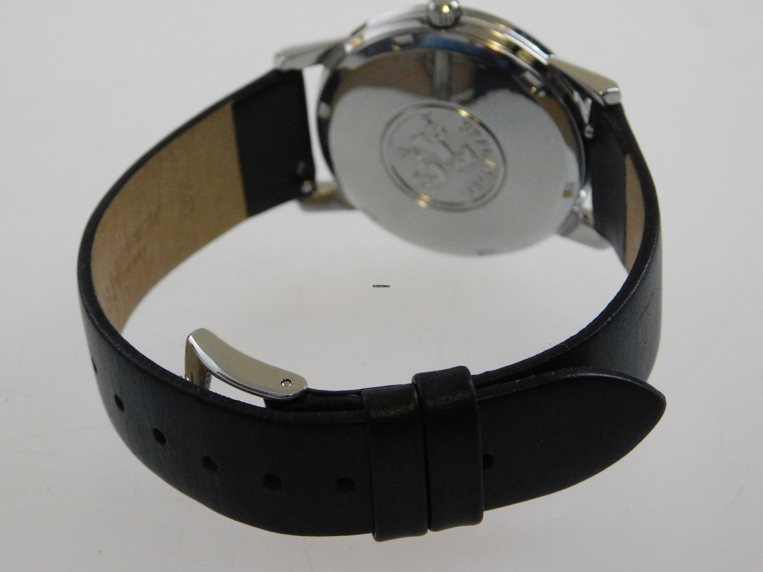Die Uhr hat ein neutrales schwarzes Lederband mit original Schließe und befindet sich im guten Zustand, siehe Fotos.