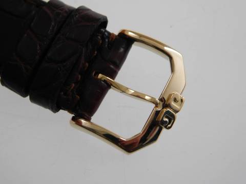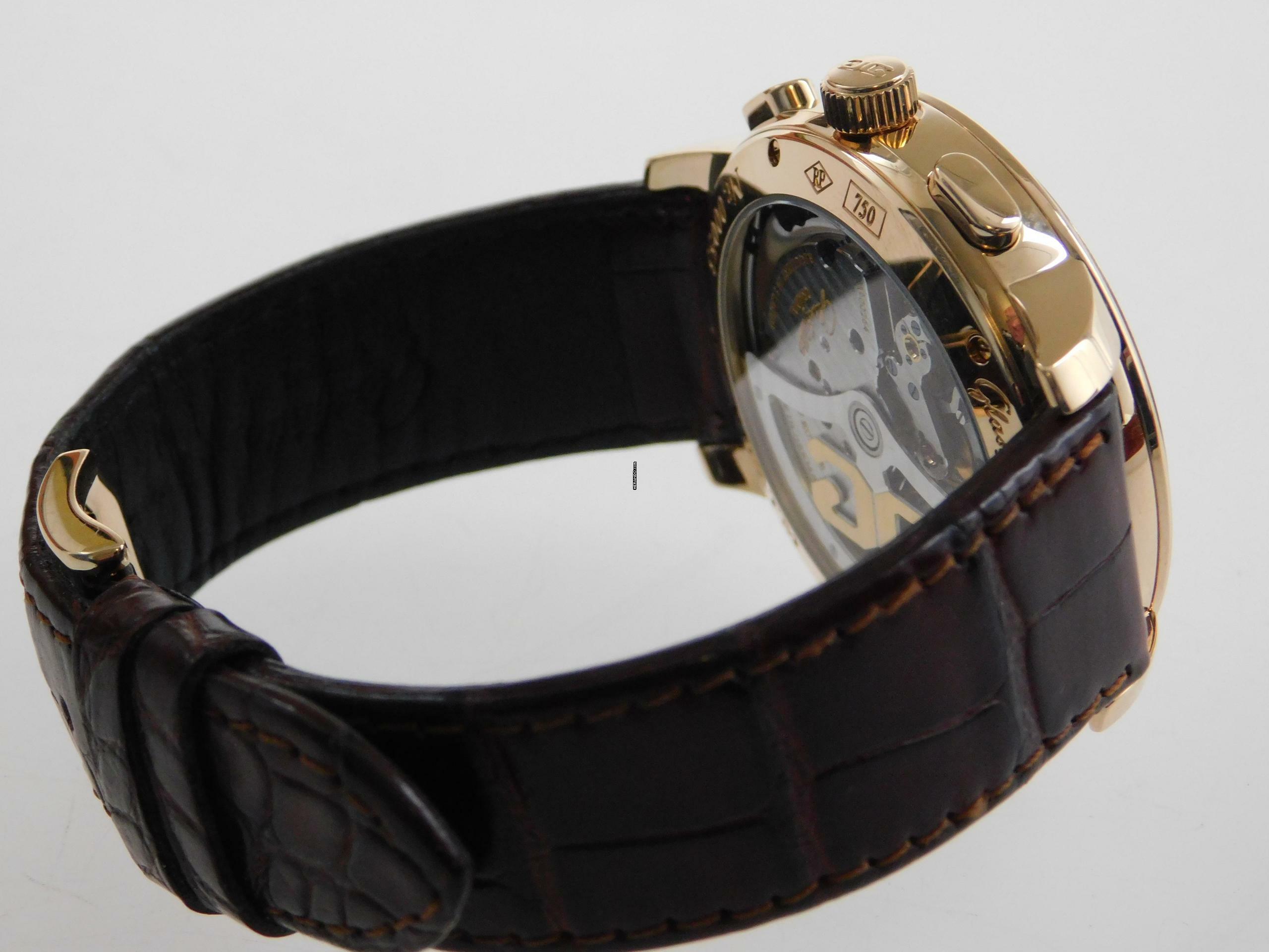 Die Uhr befindet sich im Neu Zustand mit dem original Glashütte Krokoband und der original Glashütte Dornschließe in ebenso 18 Karat Rosegold.