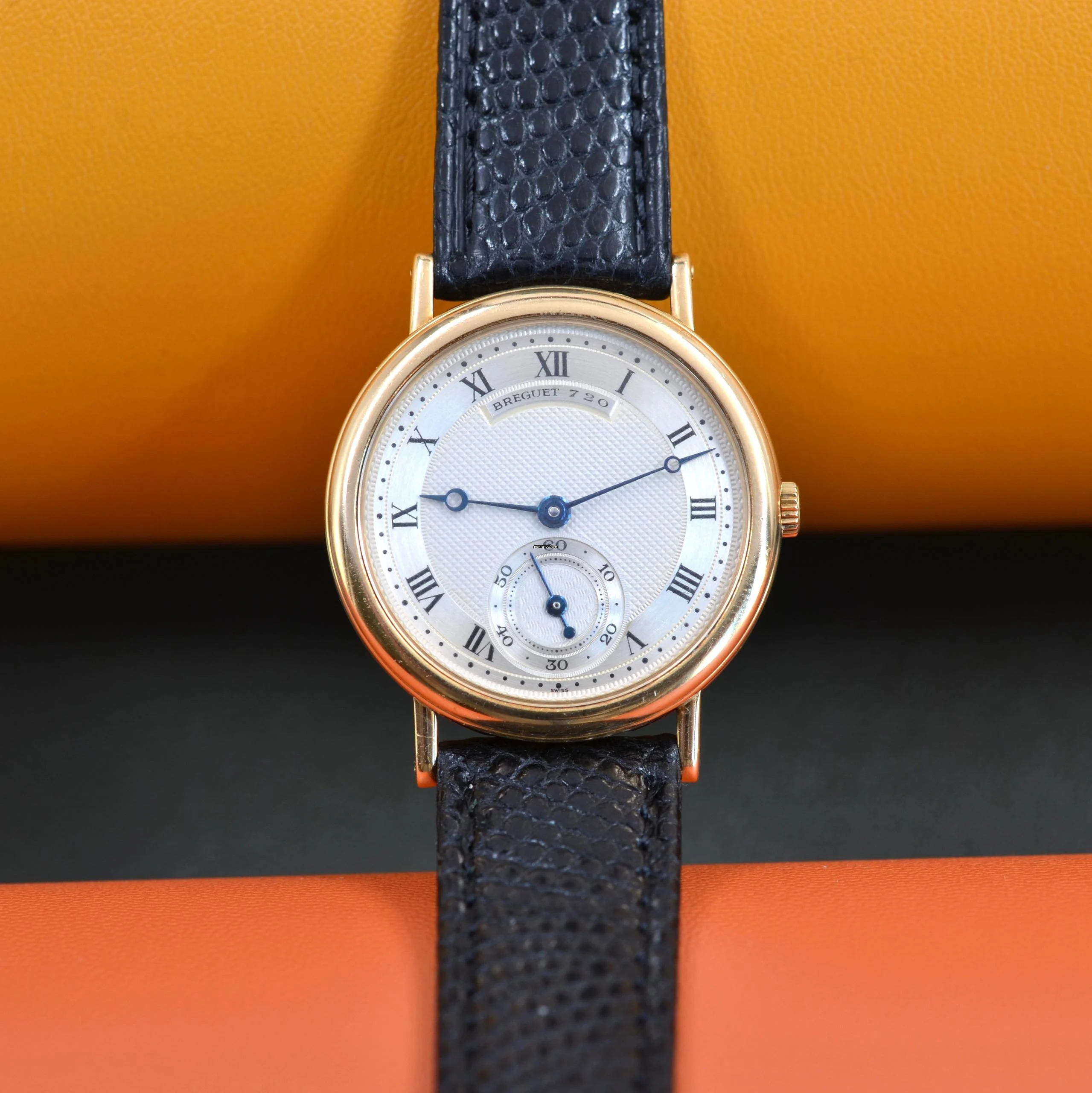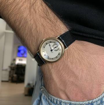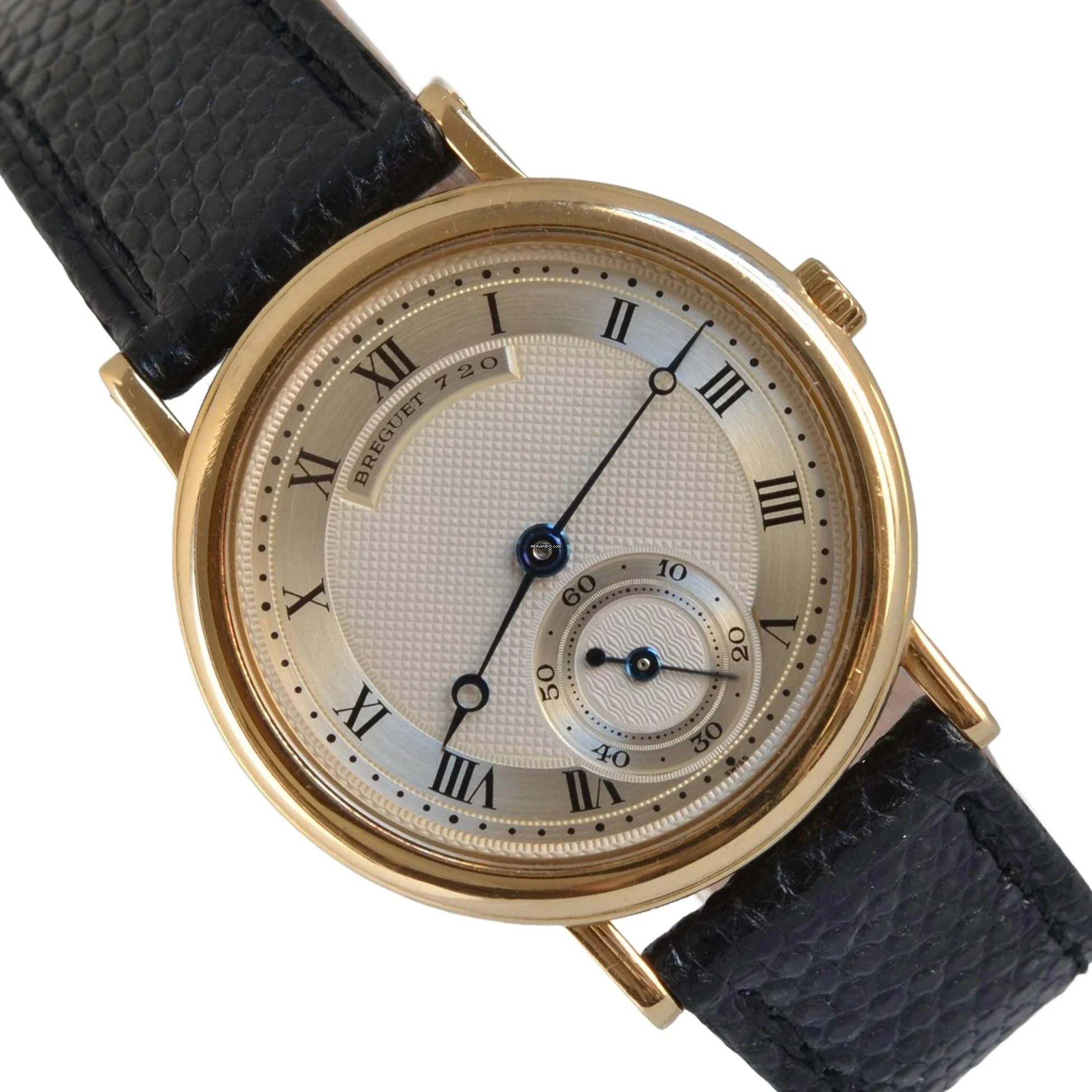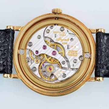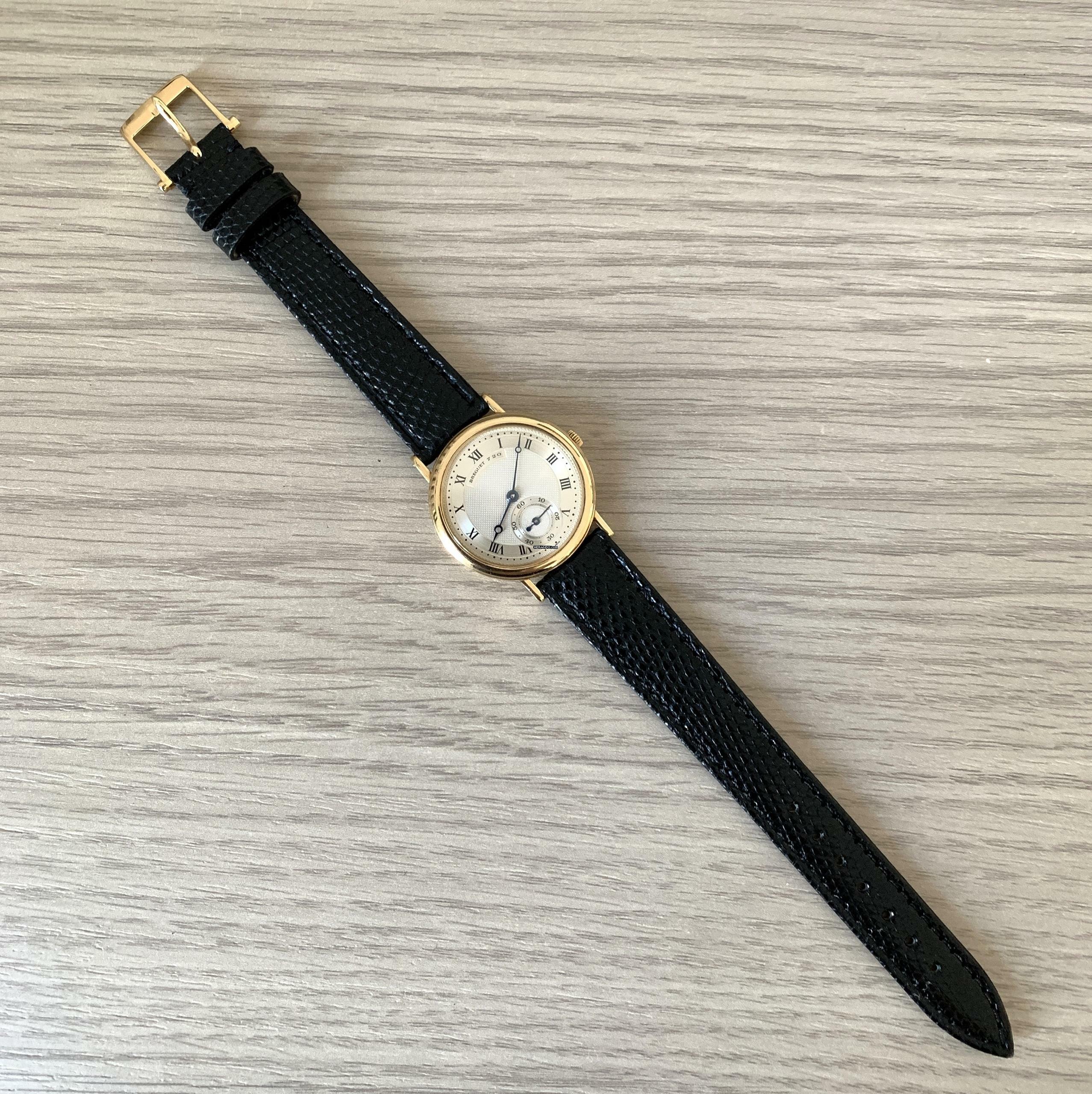 Breguet Classique Ultra-Thin yellow gold 18KT, year of production 1990, yellow gold 18KT smooth bezel, mineral glass flat, guilloché silver dial with seconds counters at hours 06:00 and blue colour hands, manual winding mechanical movement, generic black colour shiny lizard strap with yellow gold 18KT buckle original Breguet.