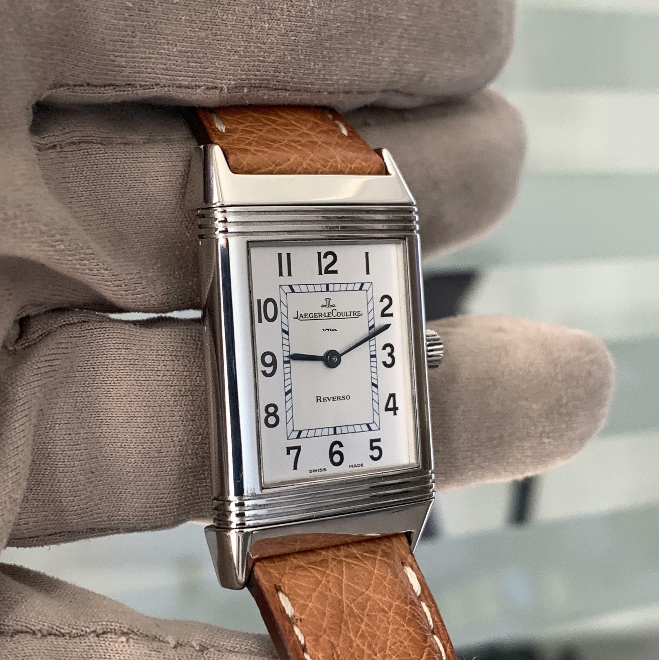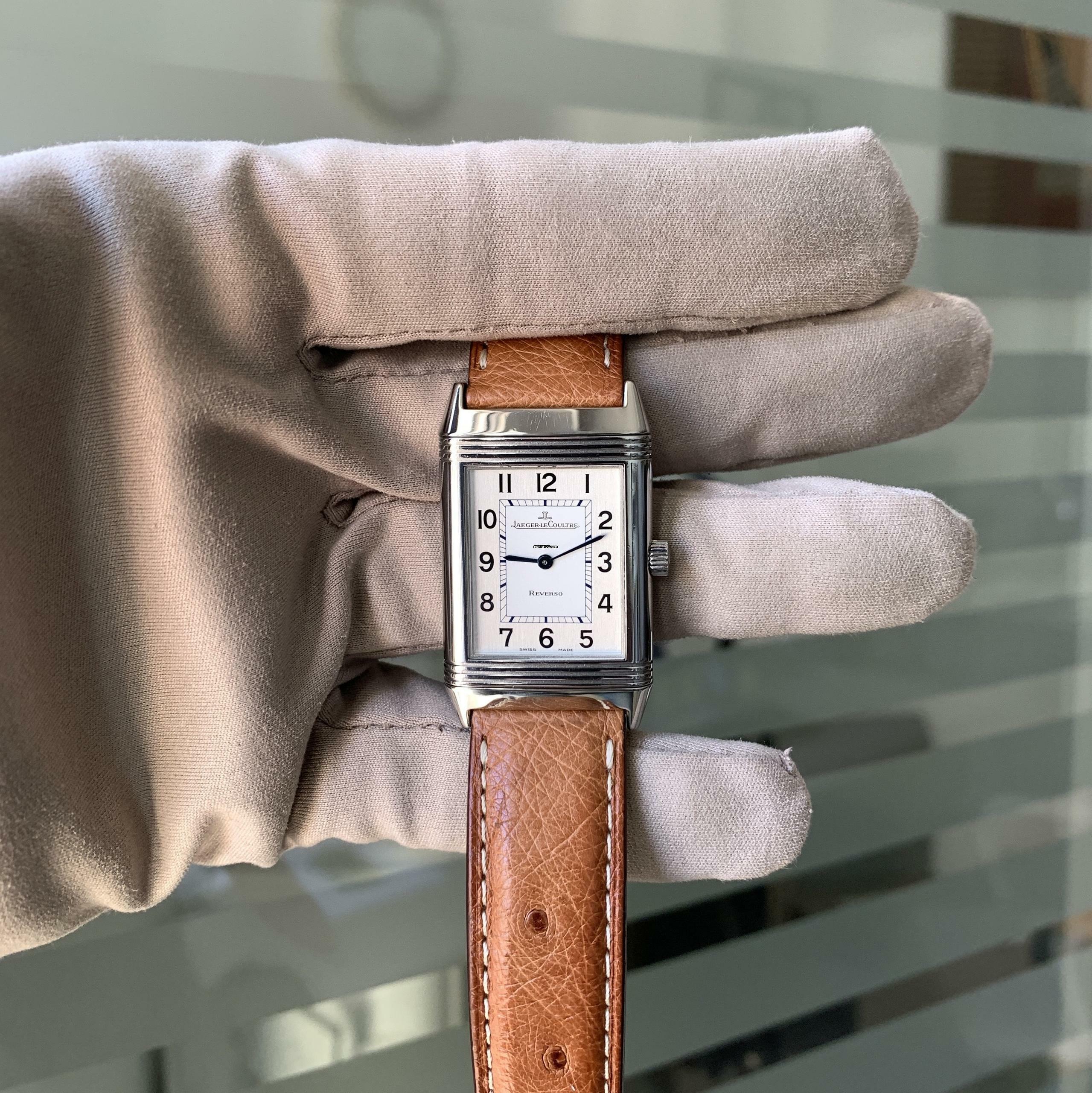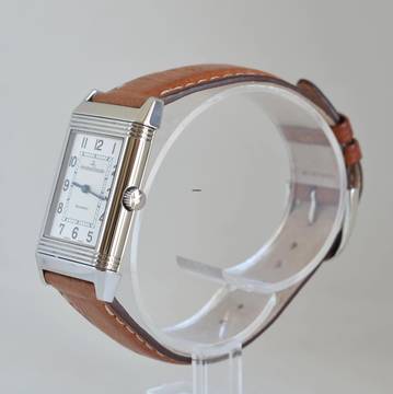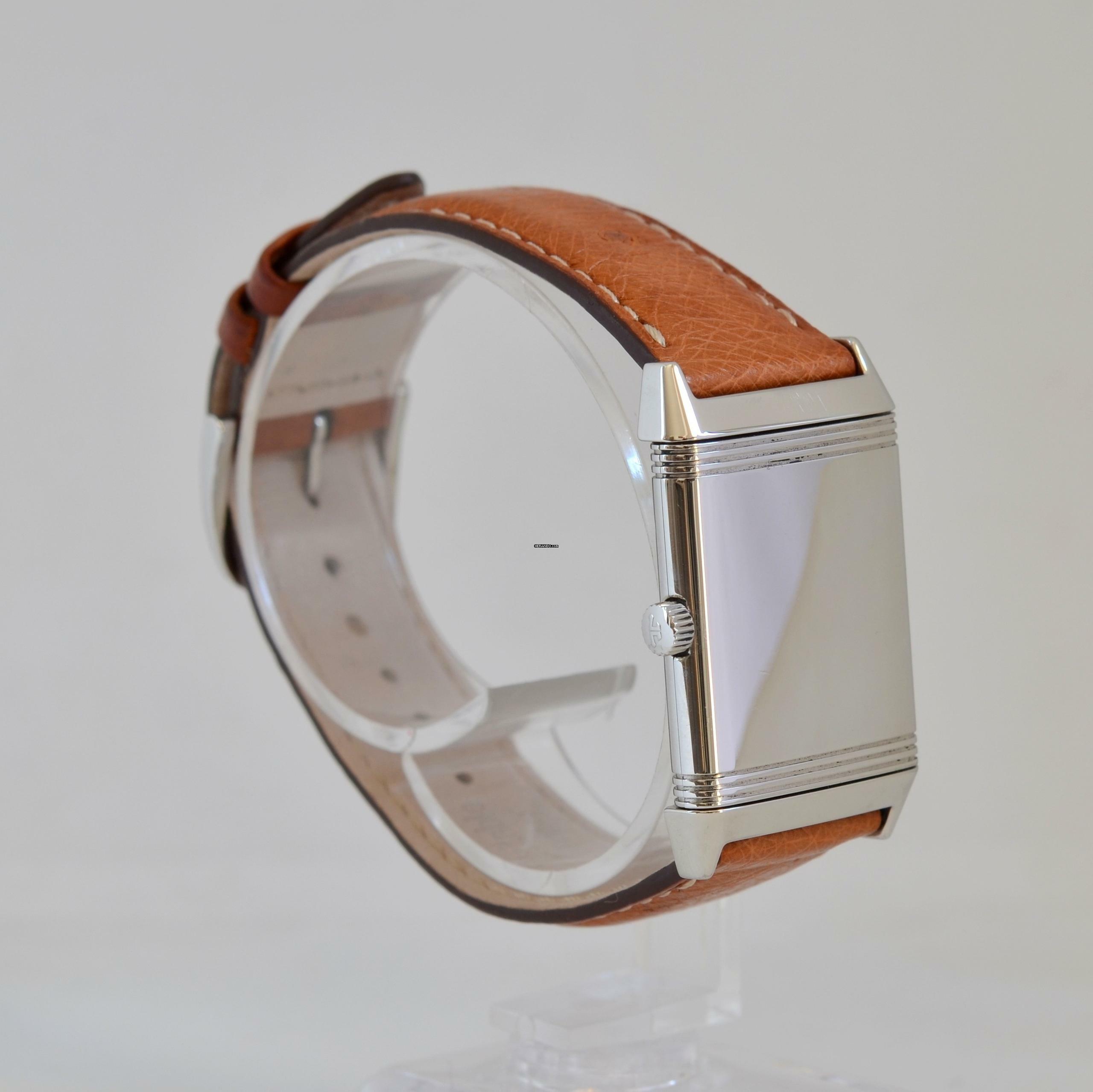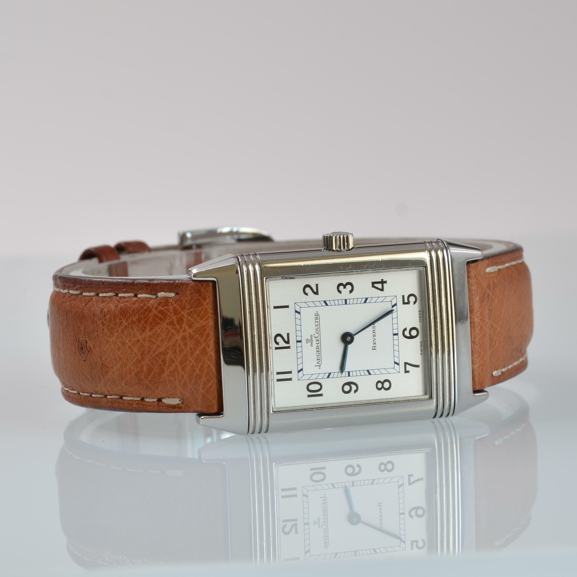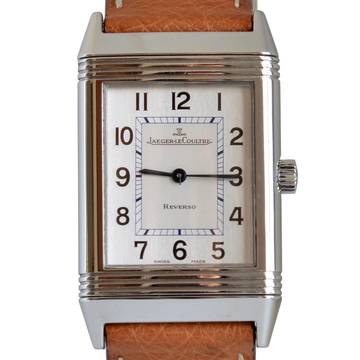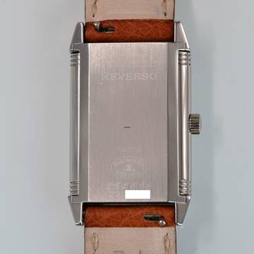 Jaeger Le-Coultre Reverso Classico Stahl, Baujahr 2002, Saphirglas entspiegelt, silberfarbenes Zifferblatt mit arabischen Indizes und blau eloxierten Zeigern, mechanisches Uhrwerk mit Handaufzug, Straußenlederarmband mit Stahlschließe Original Jaeger LeCoultre.