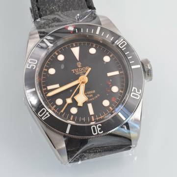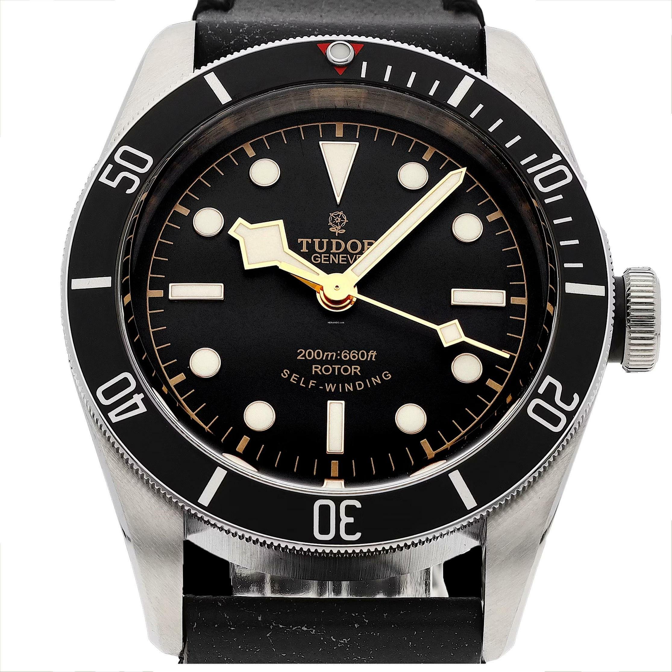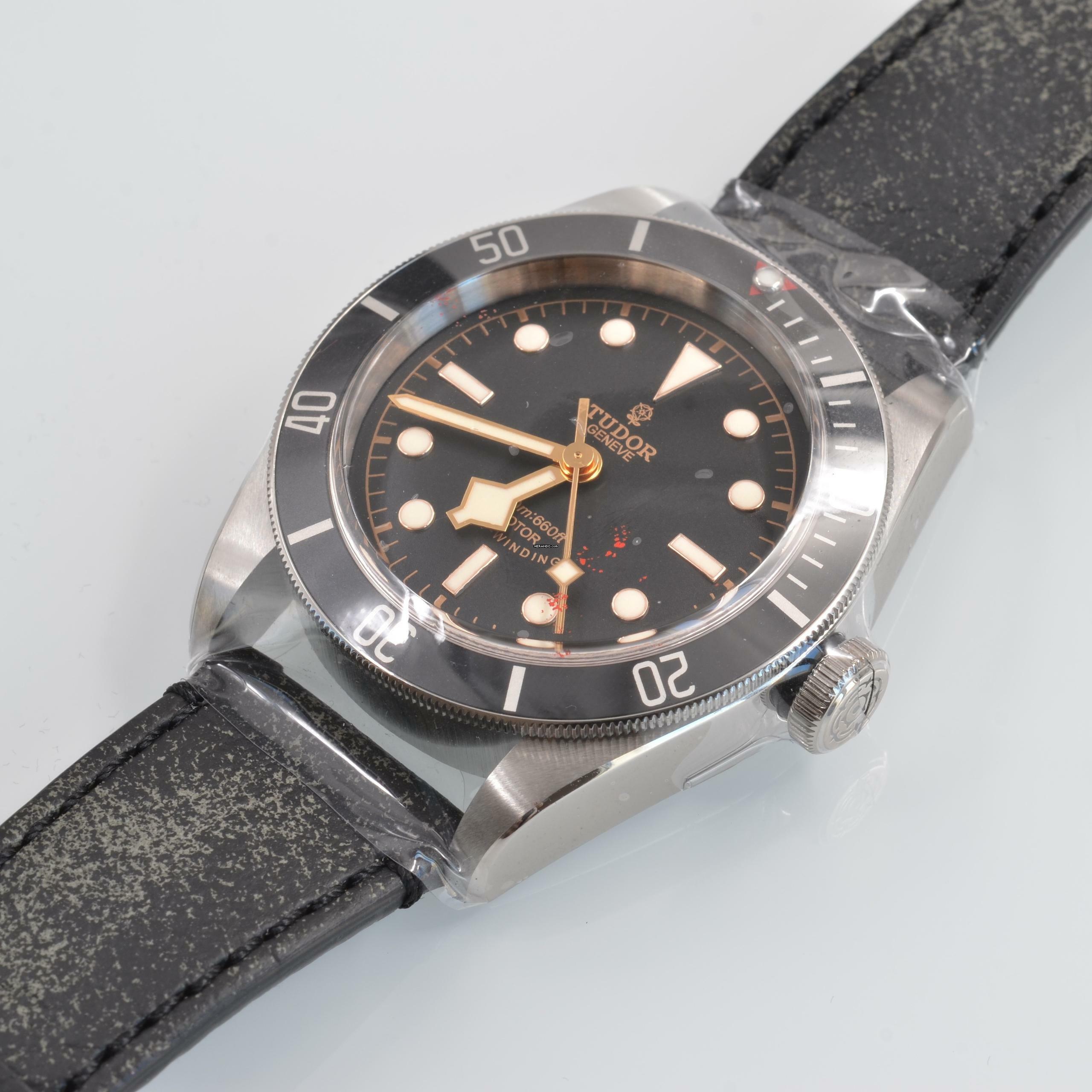 Tudor Black Bay 79220N Heritage Stahl, Baujahr 2016, einseitig drehbare Lünette aus Stahl mit schwarzem Aluminiumeinsatz, entspiegeltes Saphirglas, schwarzes Zifferblatt mit Indizes und Zeigern aus LumiNova, mechanisches Uhrwerk mit Automatikaufzug, schwarzes Kalbslederarmband mit originaler Tudor-Faltschließe aus Stahl, zusätzlich schwarzes Nato-Armband aus Stoff mit Tudor-Schnalle aus Stahl.