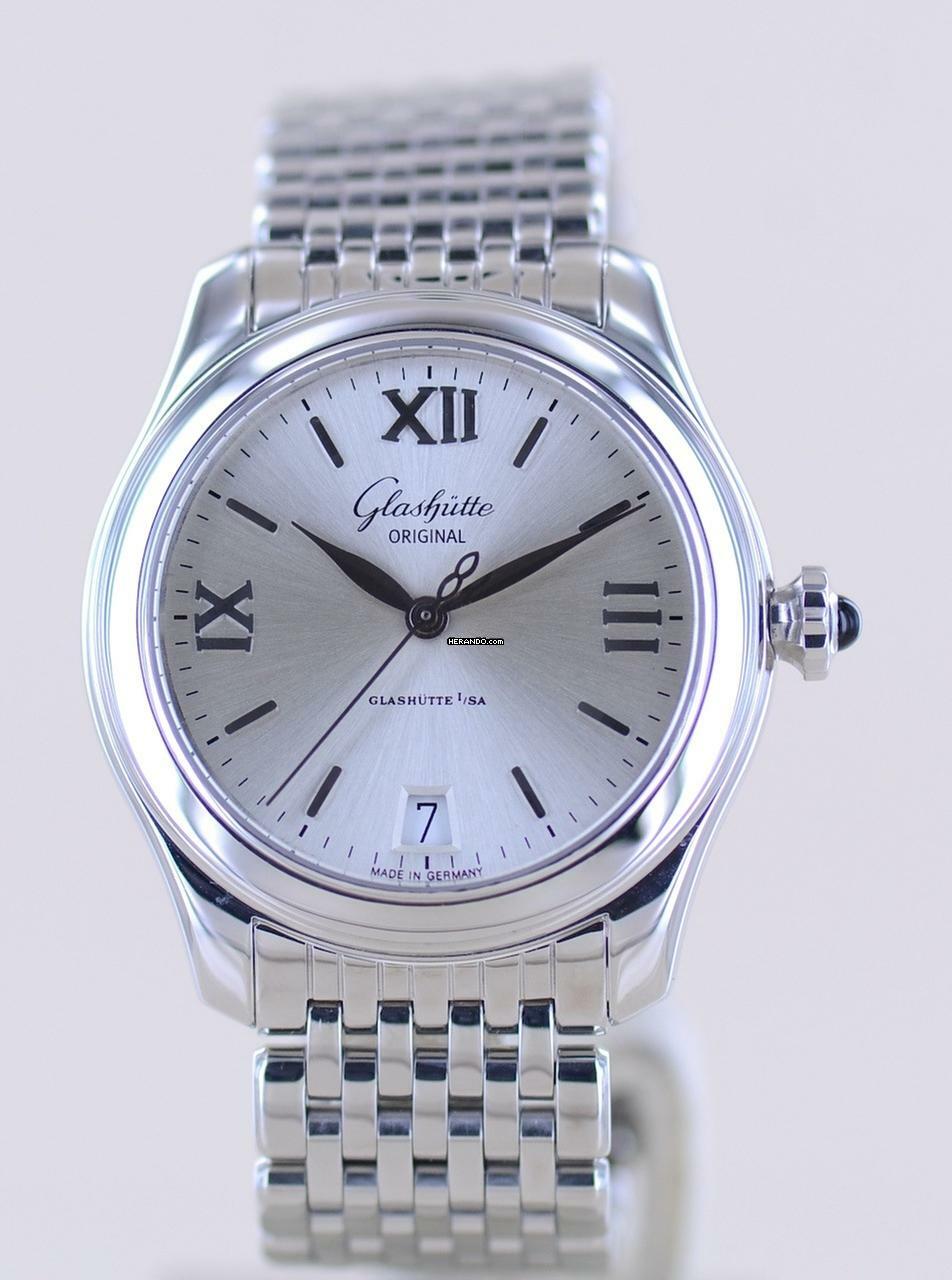 Wunderbare Glashütte Original Serenade Lady in Edelstahl. Die Uhr besitzt ein geniales zeitlos silbernes Blatt mit polierten Zeigern. Mit 36mm und dem schönen Edelstahlband mit verdeckter Faltschließe trägt sie sich elegant am Handgelenk. Aufgrund der nach unten leicht abgerundeten Gehäuseform in jeder Situation perfekt anliegend. Dank der flachen Bauhöhe auch gut zum Hemd oder Kostüm zu tragen.Diese Glashütte verbindet die klassischen, traditionellen Werte und Formsprache mit bester deutscher Uhrmachertechnologie auf höchstem Niveau. Die Serenade ist ein beliebter Klassiker am gut betuchten Damenhandgelenk und wird mit ihrer klaren Form sehr geschätzt. Mehr braucht eine Uhr nicht. Stunde, Minute, Sekunde sowie ein Datum machen sie alltagstauglich.