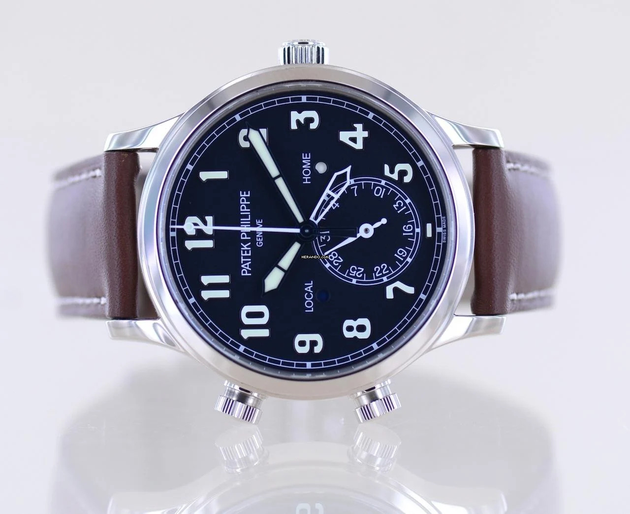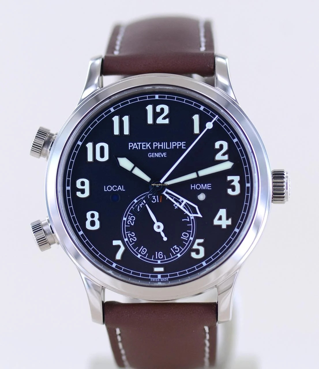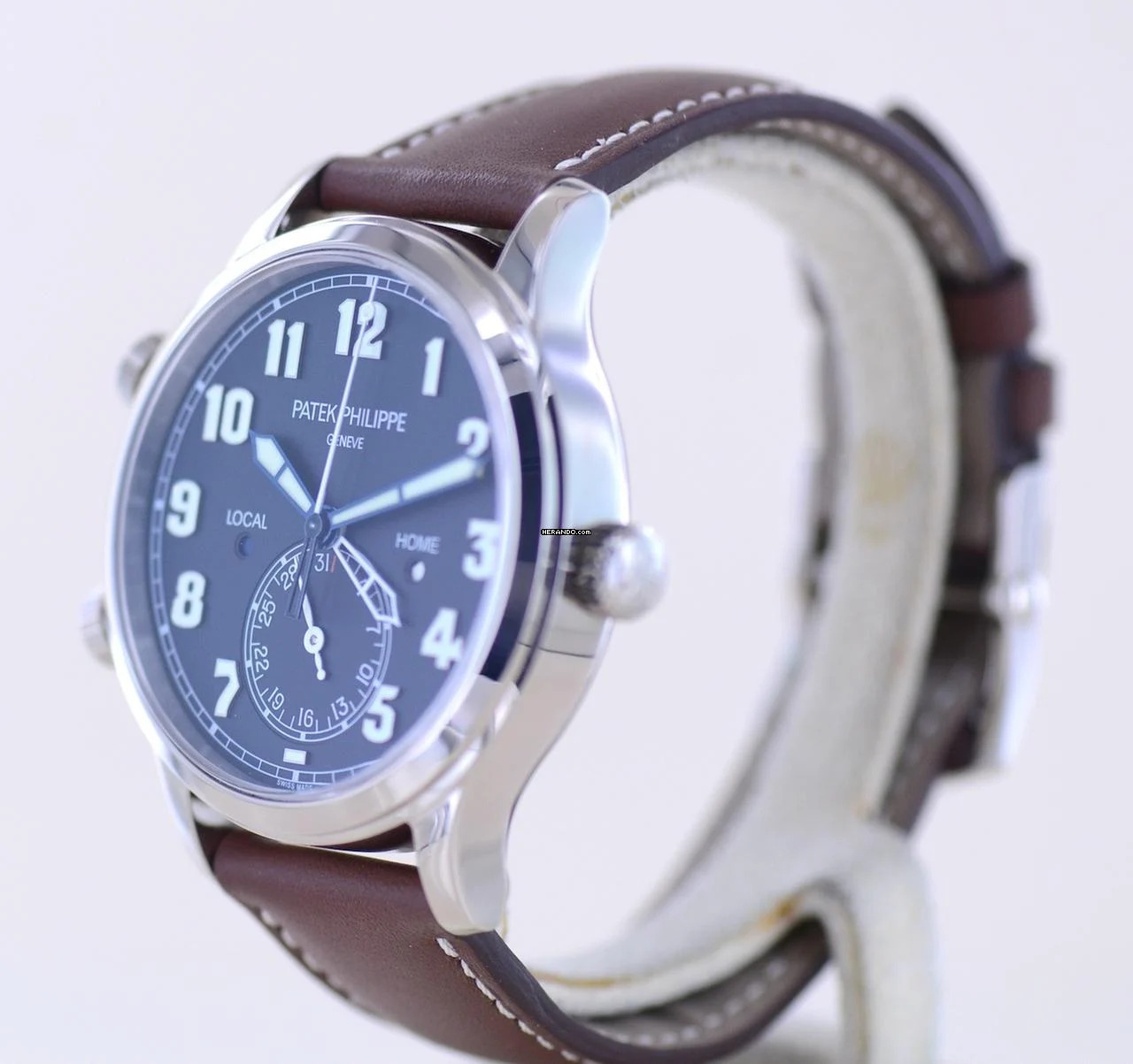 Wunderbare Patek Philippe Calatrava in 18K Weißgold. Dieses komplizierte mechanische Meisterwerk von Patek ist selten zu sehen und eine der schönsten Möglichkeiten verschiedene Zeitzonen in einer Armbanduhr anzuzeigen.Die Patek ist ein berühmter Begleiter am Handgelenk und bekannt als zeitloser Evergreen der Oberschicht mit Understatement. Sie hat zeitgemäß elegante Maße und ein sehr klares Zifferblatt. Bestens ablesbar und trotz der Funktionen angenehm übersichtlich. Es ist tiefblau und trägt große Leuchtziffern.
