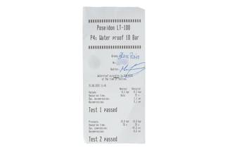 * Wenn die Uhr positiv auf Wasserdichtigkeit getestet wurde, dann gilt diese Eigenschaft zum Zeitpunkt der Messung. Wasserdichtigkeit ist nach DIN 8310 keine bleibende Eigenschaft. Sie sollte jährlich und vor besonderen Belastungen überprüft werden, da die eingebauten Dichtelemente in ihrer Funktion und im täglichen Gebrauch nachlassen. Einflüsse wie starke Temperaturschwankungen, Chlor, Seife oder Salzwasser wirken sich negativ auf die Wasserdichtigkeit aus.