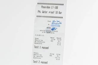 - Wasserdichtigkeit*: ja. Das Prüfprotokoll mit Prüfdruckangabe liegt bei.