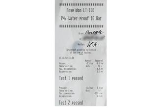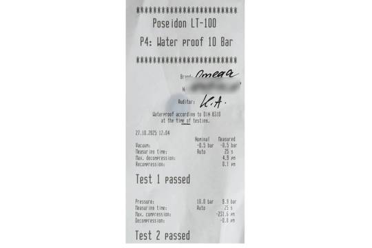 * Wenn die Uhr positiv auf Wasserdichtigkeit getestet wurde, dann gilt diese Eigenschaft zum Zeitpunkt der Messung. Wasserdichtigkeit ist nach DIN 8310 keine bleibende Eigenschaft. Sie sollte jährlich und vor besonderen Belastungen überprüft werden, da die eingebauten Dichtelemente in ihrer Funktion und im täglichen Gebrauch nachlassen. Einflüsse wie starke Temperaturschwankungen, Chlor, Seife oder Salzwasser wirken sich negativ auf die Wasserdichtigkeit aus.