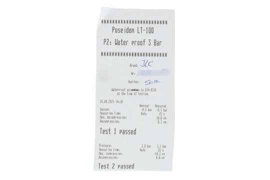 * Wenn die Uhr positiv auf Wasserdichtigkeit getestet wurde, dann gilt diese Eigenschaft zum Zeitpunkt der Messung. Wasserdichtigkeit ist nach DIN 8310 keine bleibende Eigenschaft. Sie sollte jährlich und vor besonderen Belastungen überprüft werden, da die eingebauten Dichtelemente in ihrer Funktion und im täglichen Gebrauch nachlassen. Einflüsse wie starke Temperaturschwankungen, Chlor, Seife oder Salzwasser wirken sich negativ auf die Wasserdichtigkeit aus.