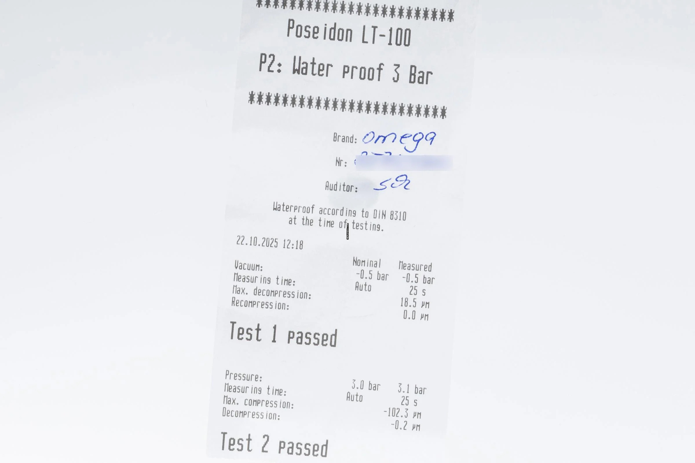 * Wenn die Uhr positiv auf Wasserdichtigkeit getestet wurde, dann gilt diese Eigenschaft zum Zeitpunkt der Messung. Wasserdichtigkeit ist nach DIN 8310 keine bleibende Eigenschaft. Sie sollte jährlich und vor besonderen Belastungen überprüft werden, da die eingebauten Dichtelemente in ihrer Funktion und im täglichen Gebrauch nachlassen. Einflüsse wie starke Temperaturschwankungen, Chlor, Seife oder Salzwasser wirken sich negativ auf die Wasserdichtigkeit aus.